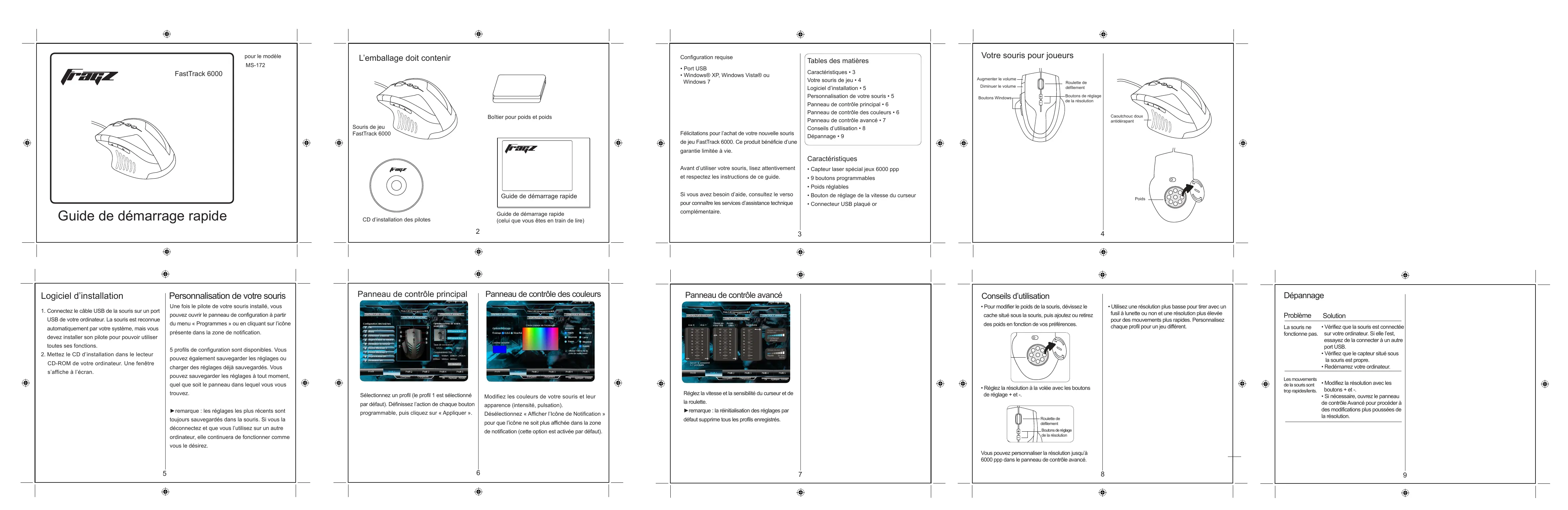 | FastTrack 6000 Guide de démarrage rapide | pour le modele MS-172 | L'emballage doit containir Souris de jeu FastTrack 6000 CD d'installation des pilotes | Boilier pour poids et poids 2 | Configuration requise • Port USB • Windows® XP, Windows Vista ou Windows 7 Félications pour l'achat de votre nouvelle sours de jeu FastTrack 6000. Ce produit bénéfice d'une garantie limitée à vie. Avant d'utiliser yours, lisiez attentionivement et respectez les instructions de ce guide. Si vous avez besoin d'aide, consultez leverso pour connaître les services d'assistance technique complémentaire. | Table des matieres Caracteristicques • 3 Vôteurs souris de jeu • 4 Logiciel d'installation • 5 Personalisation de votre coursis • 5 Panneau de contrôle principal • 6 Panneau de contrôle des couleurs • 6 Panneau de contrôle avanc • 7 Consils d'utilisation • 8 Dépannage • 9 | Vôteurs souris pour joueurs Augmenter le volume Diminuer le volume Boutons Windows Règlement de la résolution | ||||