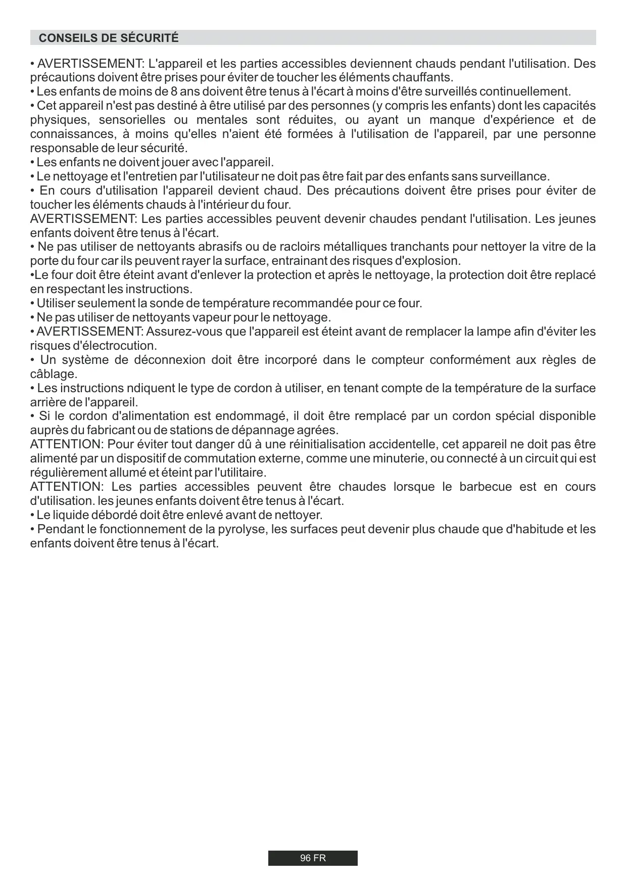 - Pendant le fonctionnement de la pyrolyse, les surfaces peut devenir plus chaude que d'habitude et les enfants doivent être tenus à l'écart. 96 FR