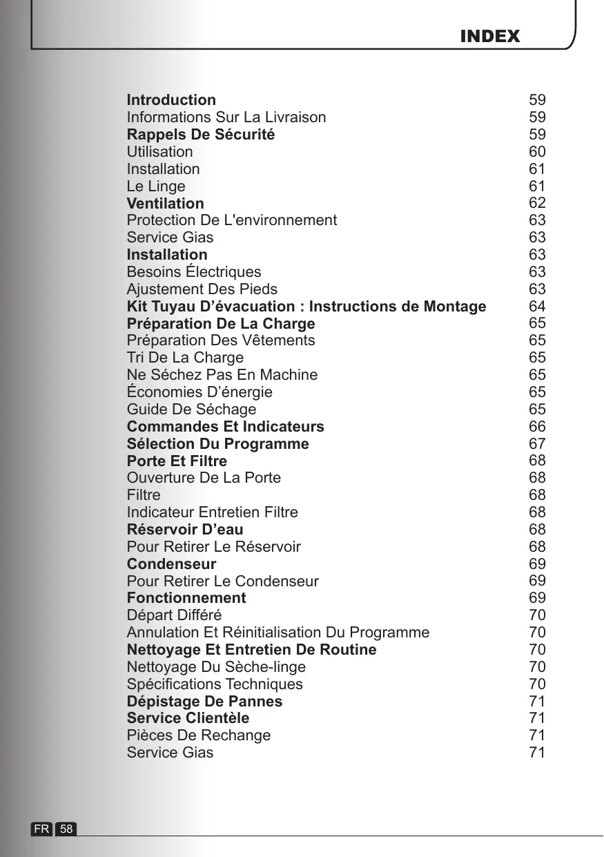 Introduction Informations Sur La Livraison Rappels De Sécurité Utilisation Installation Le Linge Ventilation Protection De L'environnement Service Gias Installation Besoins Électriques Ajustement Des Pieds Kit Tuyau D’évacuation : Instructions de Montage Préparation De La Charge Préparation Des Vêtements Tri De La Charge Ne Séchez Pas En Machine Économies D’énergie Guide De Séchage Commandes Et Indicateurs Sélection Du Programme Porte Et Filtre Ouverture De La Porte Filtre Indicateur Entretien Filtre Réservoir D’eau Pour Retirer Le Réservoir Condenseur Pour Retirer Le Condenseur Fonctionnement Départ Différé Annulation Et Réinitialisation Du Programme Nettoyage Et Entretien De Routine Nettoyage Du Sèche-linge Spécifications Techniques Dépistage De Pannes Service Clientèle Pièces De Rechange Service Gias FR 58