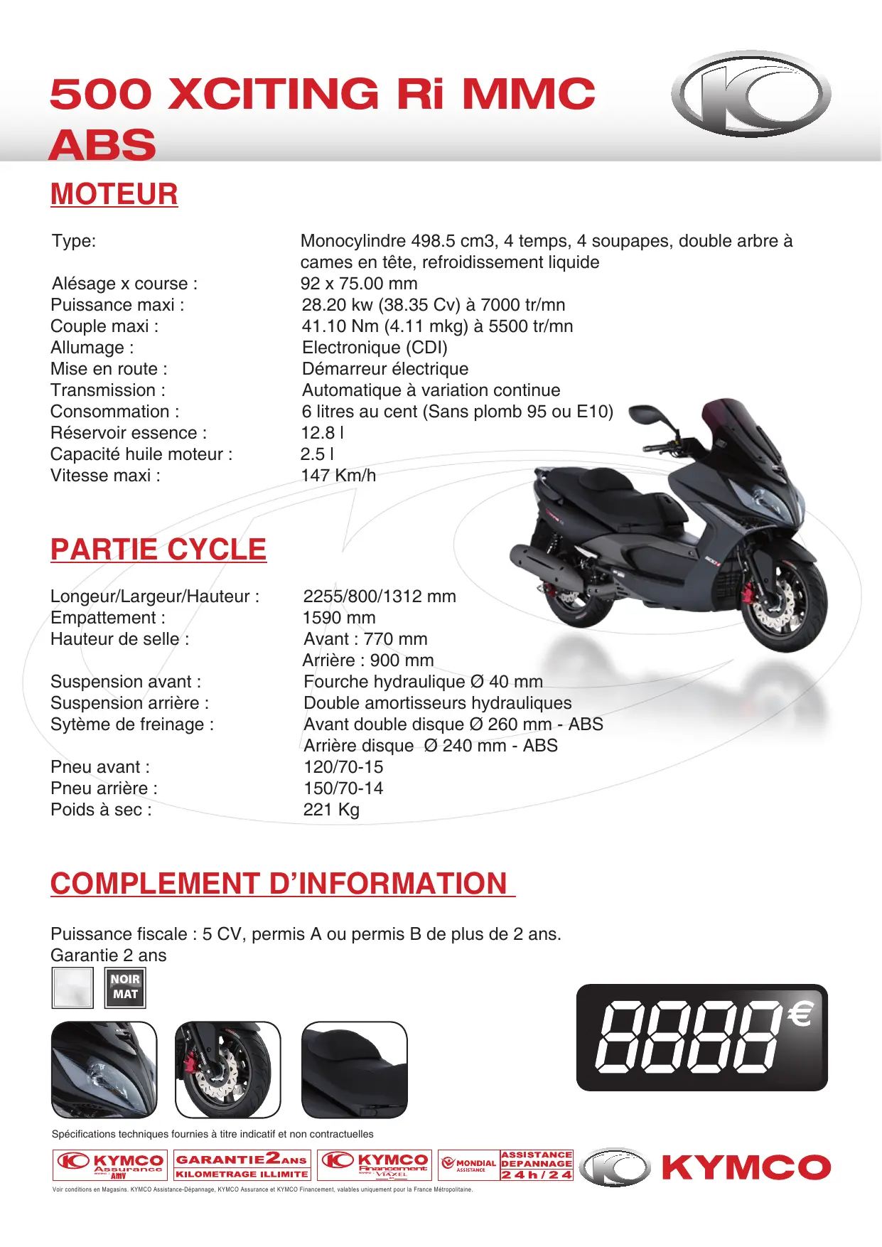 Puissance fiscale : 5 CV, permis A ou permis B de plus de 2 ans. Garantie 2 ans NOIR MAT Spécifications techniques fournies à titre indicatif et non contractuelles Voir conditions en Magasins. KYMCO Assistance-Dépannage, KYMCO Assurance et KYMCO Financement, valables uniquement pour la France Métropolitaine.