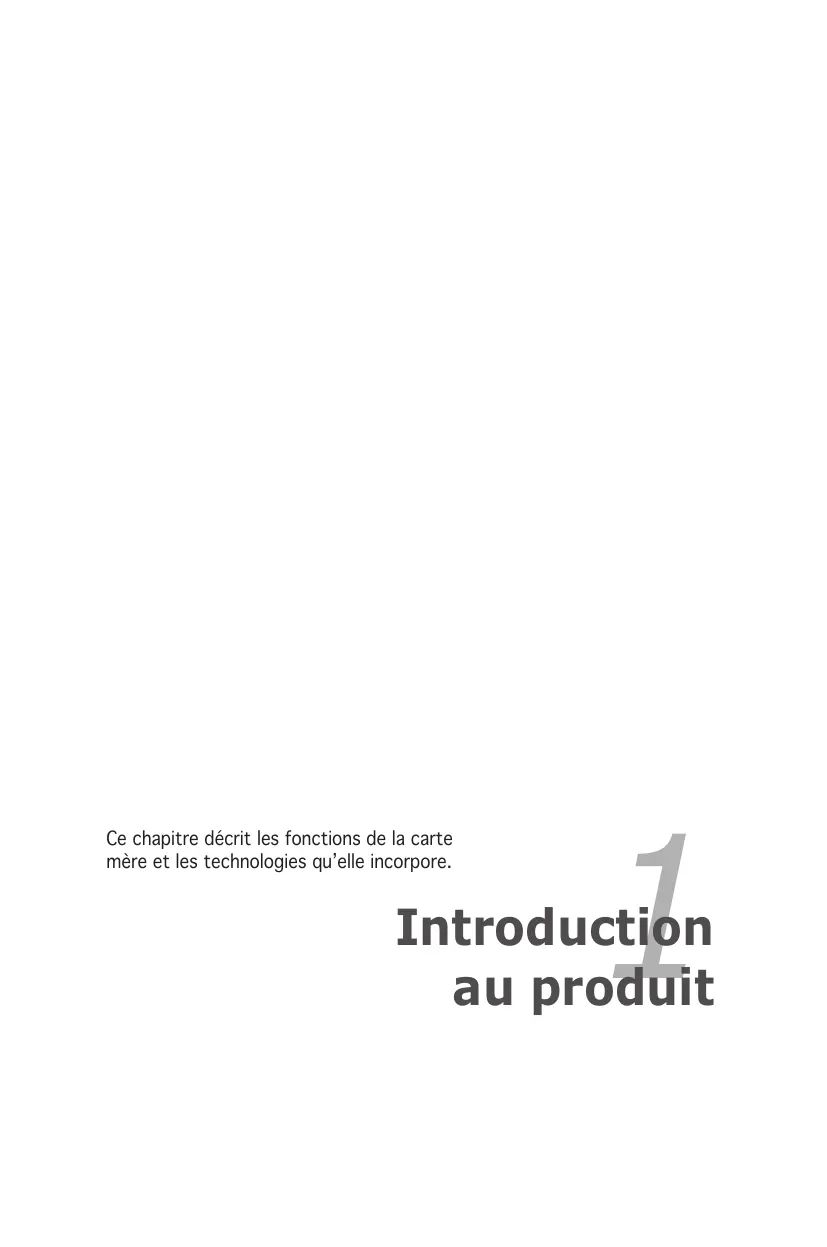 Câbles 1 x câble Serial ATA 1 x câble d’alimentation Serial ATA 1 x câble Ultra DMA 133/100/66 1 x câble pour lecteur de disquettes Accessoires “I/O shield” pour l’arrière du châssis CD d’applications CD de support des cartes mères ASUS Documentation Manuel de l’utilisateur Si l’un des éléments ci-dessus était manquant ou endommagé, contactez votre revendeur.