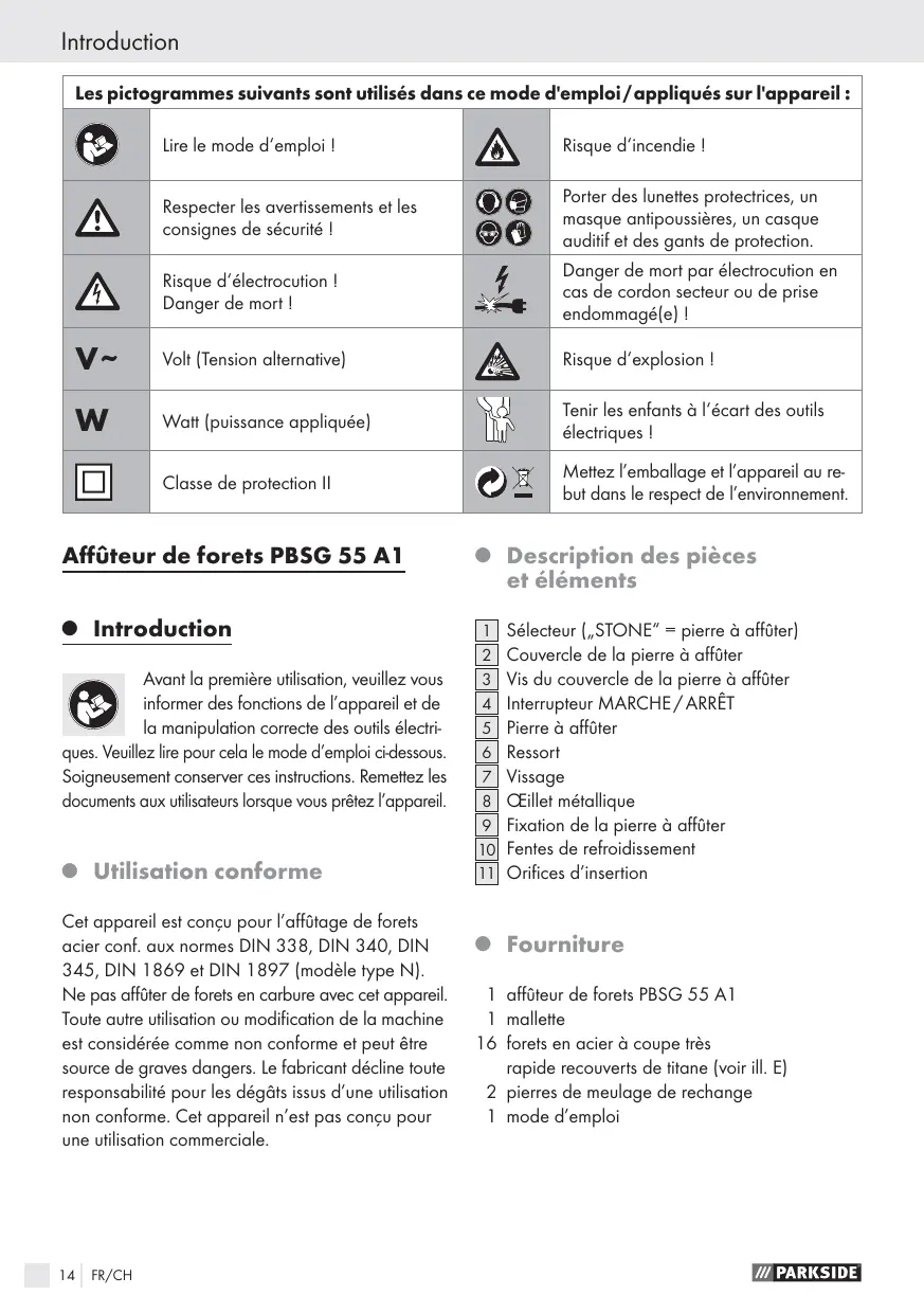 FR/CH 1 affûteur de forets PBSG 55 A1 1 mallette 16 forets en acier à coupe très rapide recouverts de titane (voir ill. E) 2 pierres de meulage de rechange 1 mode d’emploi Introduction / Instructions de sécurité générales