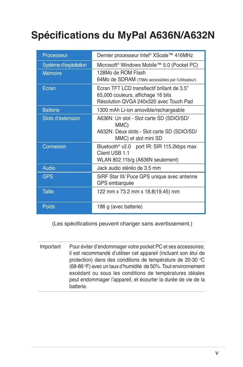 Spécifications du MyPal A636N/A632N Processeur Dernier processeur Intel® XScale™ 416MHz Système dʼexploitation Microsoft® Windows Mobile™ 5.0 (Pocket PC) 128Mo de ROM Flash 64Mo de SDRAM (75Mo accessibles par lʼutilisateur) Mémoire Ecran Ecran TFT LCD transflectif brillant de 3.5” 65,000 couleurs, affichage 16 bits Résolution QVGA 240x320 avec Touch Pad Batterie 1300 mAh Li-ion amovible/rechargeable Slots dʼextension A636N: Un slot - Slot carte SD (SDIO/SD/ MMC) A632N: Deux slots - Slot carte SD (SDIO/SD/ MMC) et slot mini SD Connexion Bluetooth® v2.0 port IR: SIR 115.2kbps max Client USB 1.1 WLAN 802.11b/g (A636N seulement) Audio Jack audio stéréo de 3.5 mm GPS SiRF Star III/ Puce GPS unique avec antenne GPS embarquée Taille 122 mm x 73.2 mm x 18.8(19.45) mm Poids 186 g (avec batterie) (Les spécifications peuvent changer sans avertissement.) Important Pour éviter dʼendommager votre pocket PC et ses accessoires; il est recommandé dʼutiliser cet appareil (incluant son étui de protection) dans des conditions de température de 20-30 oC (68-86 oF) avec un taux dʼhumidité de 50%. Tout environnement excédant ou sous les conditions de températures idéales peut endommager lʼappareil, et écourter la durée de vie de la batterie.