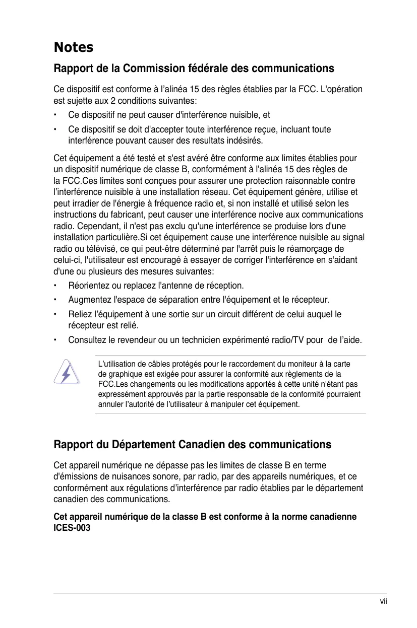 Augmentez l'espace de séparation entre l'équipement et le récepteur. Consultez le revendeur ou un technicien expérimenté radio/TV pour de l’aide. L’utilisation de câbles protégés pour le raccordement du moniteur à la carte de graphique est exigée pour assurer la conformité aux règlements de la FCC.Les changements ou les modifications apportés à cette unité n'étant pas expressément approuvés par la partie responsable de la conformité pourraient annuler l’autorité de l’utilisateur à manipuler cet équipement. Rapport du Département Canadien des communications Cet appareil numérique ne dépasse pas les limites de classe B en terme d'émissions de nuisances sonore, par radio, par des appareils numériques, et ce conformément aux régulations d’interférence par radio établies par le département canadien des communications. Cet appareil numérique de la classe B est conforme à la norme canadienne ICES-003 vii Informations de sécurité Sécurité électrique