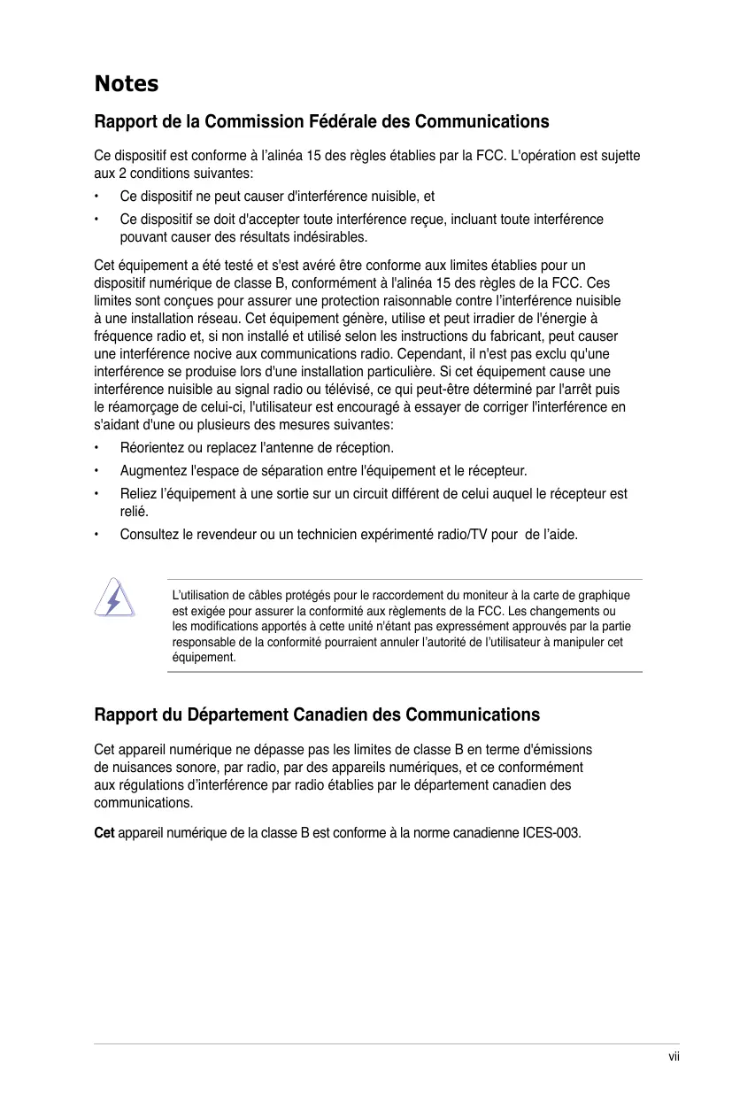 Activer la technologie ATI® CrossFireX™..................................... 5-4 Notes Rapport de la Commission Fédérale des Communications Ce dispositif est conforme à l’alinéa 15 des règles établies par la FCC. L'opération est sujette aux 2 conditions suivantes:
