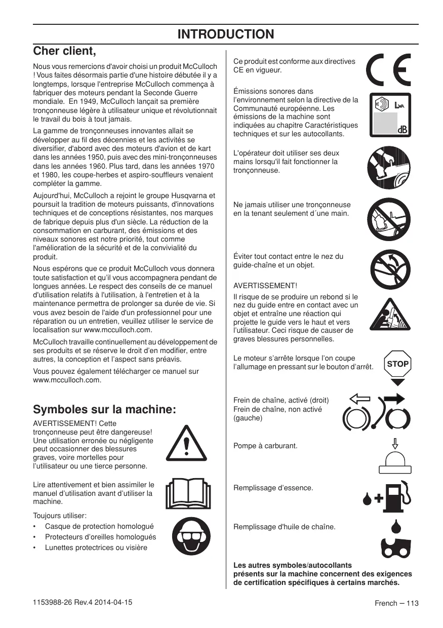 0,40 0,60 1153988-26 Rev.4 2014-04-15 INTRODUCTION Cher client, Nous vous remercions d'avoir choisi un produit McCulloch ! Vous faites désormais partie d'une histoire débutée il y a longtemps, lorsque l'entreprise McCulloch commença à fabriquer des moteurs pendant la Seconde Guerre mondiale. En 1949, McCulloch lançait sa première tronçonneuse légère à utilisateur unique et révolutionnait le travail du bois à tout jamais. La gamme de tronçonneuses innovantes allait se développer au fil des décennies et les activités se diversifier, d'abord avec des moteurs d'avion et de kart dans les années 1950, puis avec des mini-tronçonneuses dans les années 1960. Plus tard, dans les années 1970 et 1980, les coupe-herbes et aspiro-souffleurs venaient compléter la gamme. Aujourd'hui, McCulloch a rejoint le groupe Husqvarna et poursuit la tradition de moteurs puissants, d'innovations techniques et de conceptions résistantes, nos marques de fabrique depuis plus d'un siècle. La réduction de la consommation en carburant, des émissions et des niveaux sonores est notre priorité, tout comme l'amélioration de la sécurité et de la convivialité du produit. Nous espérons que ce produit McCulloch vous donnera toute satisfaction et qu’il vous accompagnera pendant de longues années. Le respect des conseils de ce manuel d'utilisation relatifs à l'utilisation, à l'entretien et à la maintenance permettra de prolonger sa durée de vie. Si vous avez besoin de l'aide d'un professionnel pour une réparation ou un entretien, veuillez utiliser le service de localisation sur www.mcculloch.com. McCulloch travaille continuellement au développement de ses produits et se réserve le droit d’en modifier, entre autres, la conception et l’aspect sans préavis. Vous pouvez également télécharger ce manuel sur www.mcculloch.com. Symboles sur la machine: AVERTISSEMENT! Cette tronçonneuse peut être dangereuse! Une utilisation erronée ou négligente peut occasionner des blessures graves, voire mortelles pour l’utilisateur ou une tierce personne. Lire attentivement et bien assimiler le manuel d’utilisation avant d’utiliser la machine. Toujours utiliser: