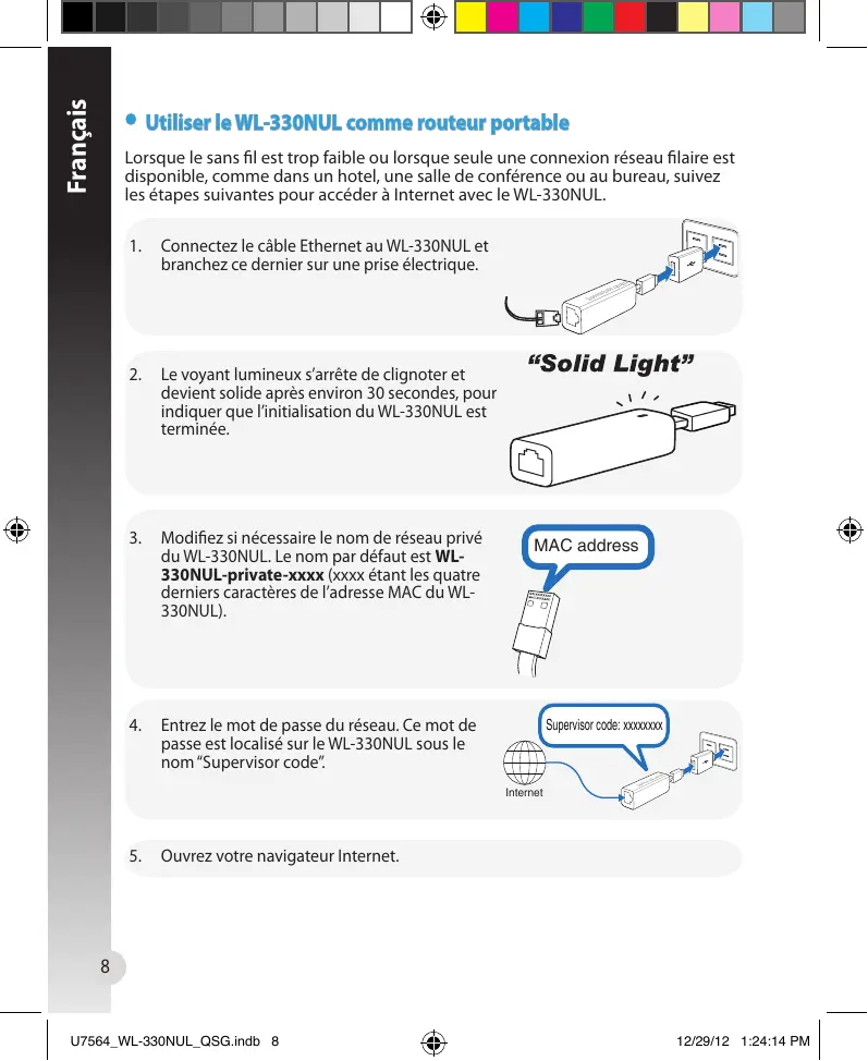 WL-330NUL. 2. Entrez le mot de passe. 3. Allez sur le site http://www.asusnetwork.net. 4. Entrez le code superviseur localisé sur le WL330NUL. 5. Ouvrez la page Wireless Setting (Paramètres sans fil). 6. Sélectionner un réseau Wi-Fi (SSID). 7. Ouvrez votre navigateur Internet.