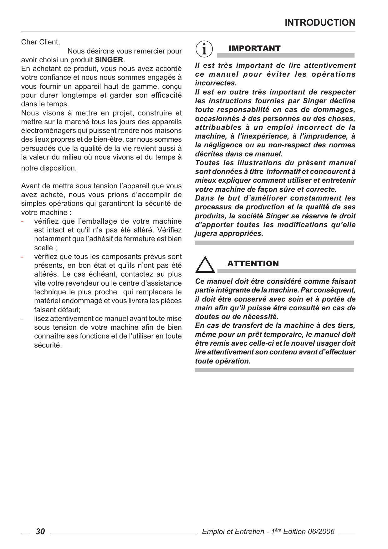 INTRODUCTION Cher Client, Nous désirons vous remercier pour avoir choisi un produit SINGER. En achetant ce produit, vous nous avez accordé YRWUHFRQ¿DQFHHWQRXVQRXVVRPPHVHQJDJpVj vous fournir un appareil haut de gamme, conçu pour durer longtemps et garder son efficacité dans le temps. Nous visons à mettre en projet, construire et mettre sur le marché tous les jours des appareils électroménagers qui puissent rendre nos maisons des lieux propres et de bien-être, car nous sommes persuadés que la qualité de la vie revient aussi à la valeur du milieu où nous vivons et du temps à notre disposition. Avant de mettre sous tension l’appareil que vous avez acheté, nous vous prions d’accomplir de simples opérations qui garantiront la sécurité de votre machine : - vérifiez que l’emballage de votre machine HVW LQWDFW HW TX¶LO Q¶D SDV pWp DOWpUp 9pUL¿H] notamment que l’adhésif de fermeture est bien scellé ; - YpUL¿H]TXHWRXVOHVFRPSRVDQWVSUpYXVVRQW présents, en bon état et qu’ils n’ont pas été altérés. Le cas échéant, contactez au plus vite votre revendeur ou le centre d’assistance technique le plus proche qui remplacera le matériel endommagé et vous livrera les pièces faisant défaut; - lisez attentivement ce manuel avant toute mise VRXV WHQVLRQ GH YRWUH PDFKLQH D¿Q GH ELHQ connaître ses fonctions et de l’utiliser en toute sécurité.