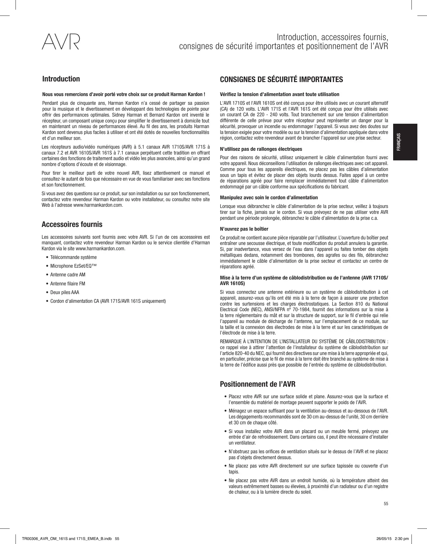 Nous vous remercions d’avoir porté votre choix sur ce produit Harman Kardon ! Vérifiez la tension d’alimentation avant toute utilisation Pendant plus de cinquante ans, Harman Kardon n’a cessé de partager sa passion pour la musique et le divertissement en développant des technologies de pointe pour offrir des performances optimales. Sidney Harman et Bernard Kardon ont inventé le récepteur, un composant unique conçu pour simplifier le divertissement à domicile tout en maintenant un niveau de performances élevé. Au fil des ans, les produits Harman Kardon sont devenus plus faciles à utiliser et ont été dotés de nouvelles fonctionnalités et d’un meilleur son. L'AVR 1710S et l'AVR 1610S ont été conçus pour être utilisés avec un courant alternatif (CA) de 120 volts. L'AVR 171S et l'AVR 161S ont été conçus pour être utilisés avec un courant CA de 220 - 240 volts. Tout branchement sur une tension d’alimentation différente de celle prévue pour votre récepteur peut représenter un danger pour la sécurité, provoquer un incendie ou endommager l’appareil. Si vous avez des doutes sur la tension exigée pour votre modèle ou sur la tension d’alimentation appliquée dans votre région, contactez votre revendeur avant de brancher l’appareil sur une prise secteur. Les récepteurs audio/vidéo numériques (AVR) à 5.1 canaux AVR 1710S/AVR 171S à canaux 7.2 et AVR 1610S/AVR 161S à 7.1 canaux perpétuent cette tradition en offrant certaines des fonctions de traitement audio et vidéo les plus avancées, ainsi qu’un grand nombre d’options d’écoute et de visionnage. N’utilisez pas de rallonges électriques Pour tirer le meilleur parti de votre nouvel AVR, lisez attentivement ce manuel et consultez-le autant de fois que nécessaire en vue de vous familiariser avec ses fonctions et son fonctionnement. Si vous avez des questions sur ce produit, sur son installation ou sur son fonctionnement, contactez votre revendeur Harman Kardon ou votre installateur, ou consultez notre site Web à l’adresse www.harmankardon.com. Accessoires fournis Les accessoires suivants sont fournis avec votre AVR. Si l’un de ces accessoires est manquant, contactez votre revendeur Harman Kardon ou le service clientèle d’Harman Kardon via le site www.harmankardon.com.