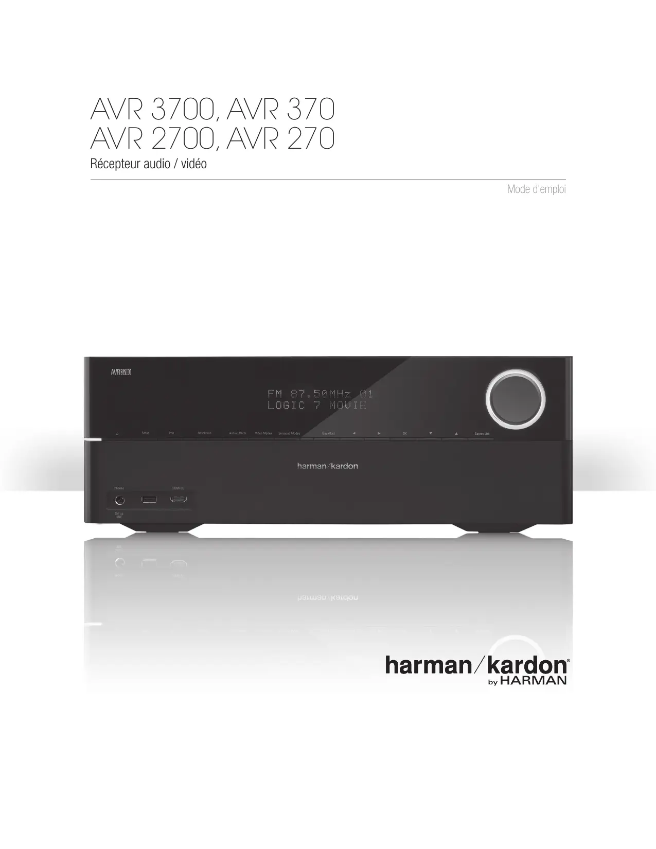 Nous vous remercions d’avoir porté votre choix sur ce produit Harman Kardon! Vérifiez la tension d’alimentation avant toute utilisation Pendant plus de cinquante ans, Harman Kardon n’a cessé de partager sa passion pour la musique et le divertissement en développant des technologies de pointe pour offrir des performances optimales. Sidney Harman et Bernard Kardon ont inventé le récepteur, un composant unique conçu pour simplifier le divertissement à domicile tout en maintenant un niveau de performances élevé. Au fil des ans, les produits Harman Kardon sont devenus plus faciles à utiliser et ont été dotés de nouvelles fonctionnalités et d’un meilleur son. Les récepteurs audio/vidéo numériques à 7.1 canaux AVR 3700/AVR 370 à canaux 7.2 et AVR 2700/AVR 270 à 7.1 canaux perpétuent cette tradition en offrant certaines des fonctions de traitement audio et vidéo les plus avancées, ainsi qu’un grand nombre d’options d’écoute et de visionnage. Pour tirer le meilleur parti de votre nouveau récepteur, lisez attentivement ce manuel et consultez-le autant de fois que nécessaire en vue de vous familiariser avec ses fonctions et son fonctionnement. Si vous avez des questions sur ce produit, sur son installation ou sur son fonctionnement, contactez votre revendeur Harman Kardon ou votre installateur, ou consultez notre site Web à l’adresse www.harmankardon.com. Accessoires fournis Les accessoires suivants sont fournis avec votre récepteur. Si l’un de ces accessoires est manquant, contactez votre revendeur Harman Kardon ou le service clientèle d’Harman Kardon via le site www.harmankardon.com.