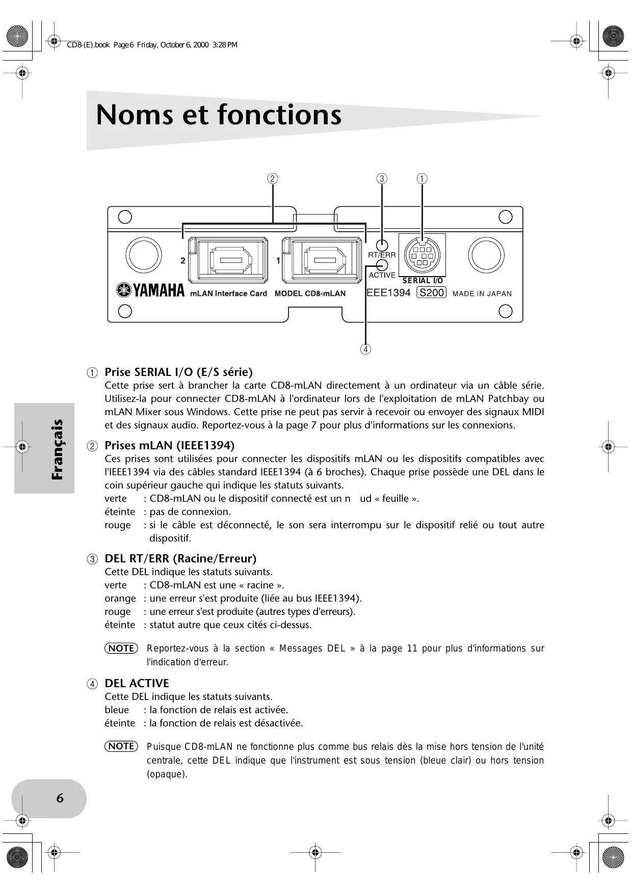 @ Prise SERIAL 1/0 (E/S série) Cette prise sert à brancher la carte CD8-mLAN directement à un ordinateur via un câble série. Utilisez-la pour connecter CD8-mLAN à l'ordinateur lors de l'exploitation de mLAN Patchbay ou mLAN Mixer sous Windows. Cette prise ne peut pas servir à recevoir ou envoyer des signaux MIDI et des signaux audio. Reportez-vous à la page 7 pour plus d'informations sur les connexions. | Prises mMLAN (IEEE1394) re Ces prises sont utilisées pour connecter les dispositifs mLAN ou les dispositifs compatibles avec l'IEEE1394 via des câbles standard IEEE1394 (à 6 broches). Chaque prise possède une DEL dans le coin supérieur gauche qui indique les statuts suivants. verte _: CD8-mLAN ou le dispositif connecté est un n ud « feuille ». éteinte : pas de connexion. rouge _: si le câble est déconnecté, le son sera interrompu sur le dispositif relié ou tout autre dispositif. DEL RT/ERR (Racine/Erreur) Cette DEL indique les statuts suivants. verte : CD8-mLAN est une « racine ». orange : une erreur s'est produite (liée au bus IEEE 394). rouge _ : une erreur s'est produite (autres types d'erreurs). éteinte: statut autre que ceux cités ci-dessus.