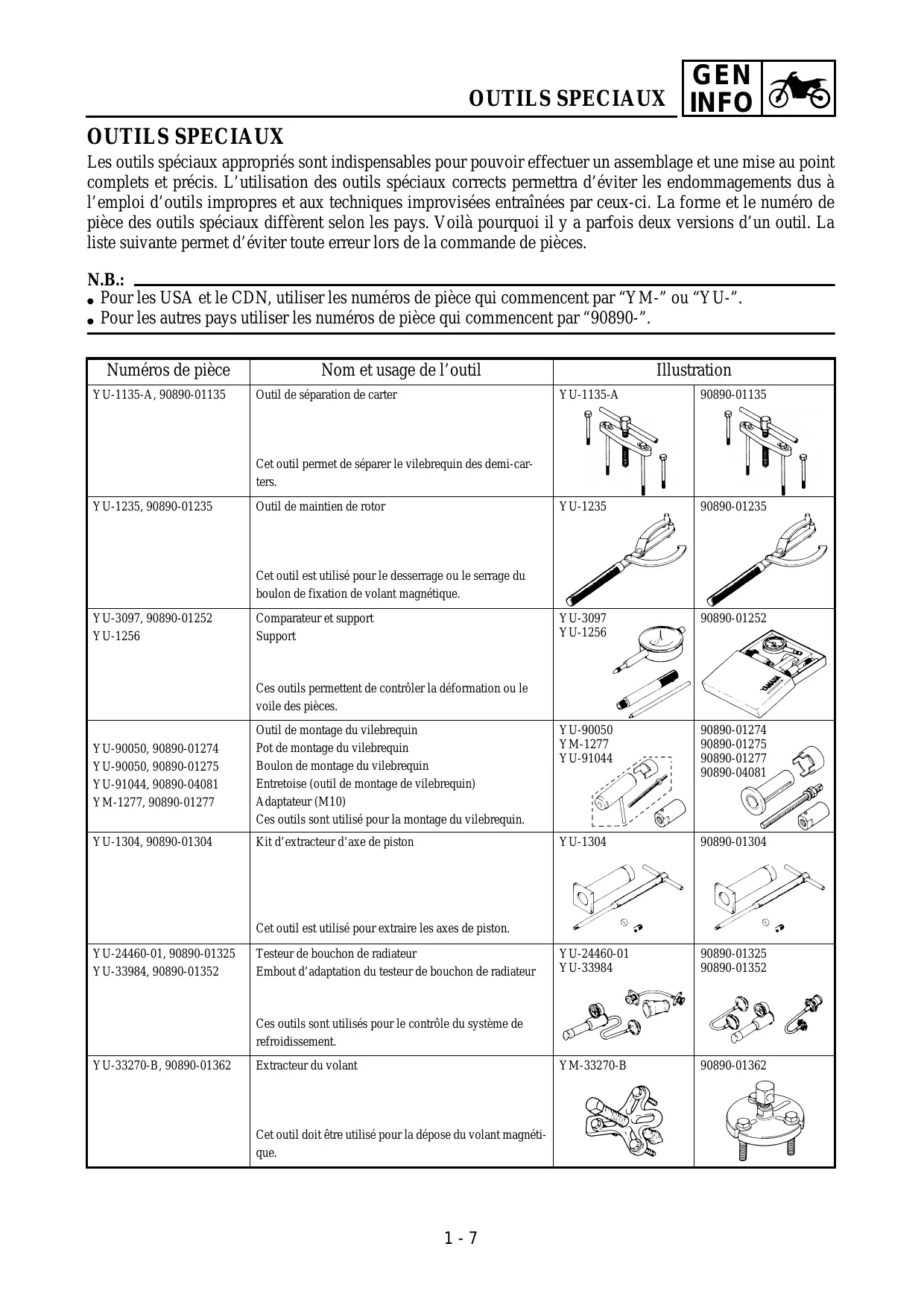 OUTILS SPECIAUX GEN INFO OUTILS SPECIAUX Les outils spéciaux appropriés sont indispensables pour pouvoir effectuer un assemblage et une mise au point complets et précis. L’utilisation des outils spéciaux corrects permettra d’éviter les endommagements dus à l’emploi d’outils impropres et aux techniques improvisées entraînées par ceux-ci. La forme et le numéro de pièce des outils spéciaux diffèrent selon les pays. Voilà pourquoi il y a parfois deux versions d’un outil. La liste suivante permet d’éviter toute erreur lors de la commande de pièces. N.B.: Pour les USA et le CDN, utiliser les numéros de pièce qui commencent par “YM-” ou “YU-”. ● Pour les autres pays utiliser les numéros de pièce qui commencent par “90890-”. ●