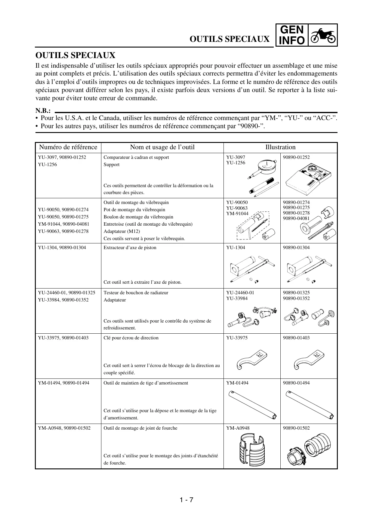 N.B.: • Pour les U.S.A. et le Canada, utiliser les numéros de référence commençant par “YM-”, “YU-” ou “ACC-”. • Pour les autres pays, utiliser les numéros de référence commençant par “90890-”. Numéro de référence YU-3097, 90890-01252 YU-1256