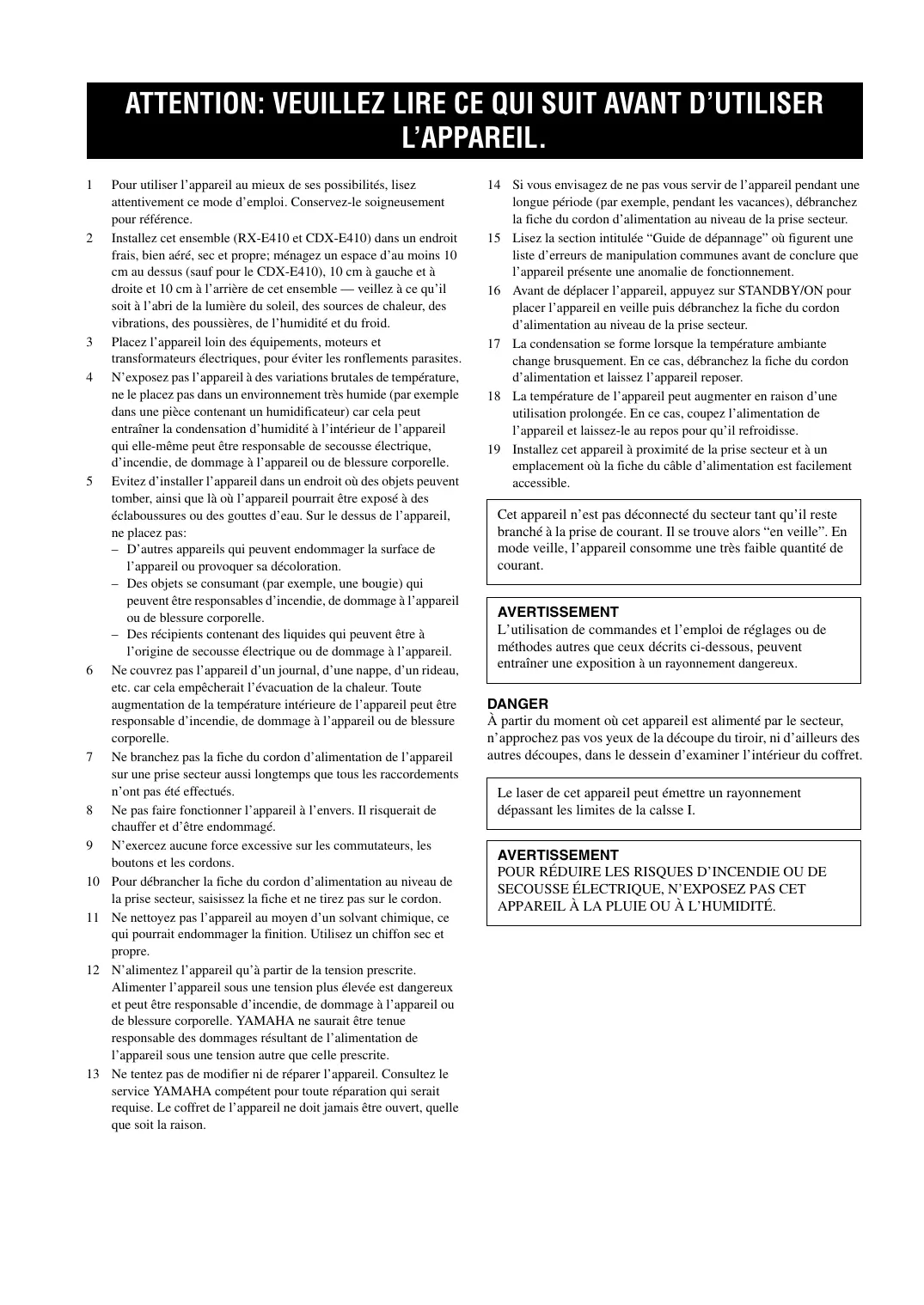 Pour utiliser l’appareil au mieux de ses possibilités, lisez attentivement ce mode d’emploi. Conservez-le soigneusement pour référence. Installez cet ensemble (RX-E410 et CDX-E410) dans un endroit frais, bien aéré, sec et propre; ménagez un espace d’au moins 10 cm au dessus (sauf pour le CDX-E410), 10 cm à gauche et à droite et 10 cm à l’arrière de cet ensemble — veillez à ce qu’il soit à l’abri de la lumière du soleil, des sources de chaleur, des vibrations, des poussières, de l’humidité et du froid. Placez l’appareil loin des équipements, moteurs et transformateurs électriques, pour éviter les ronflements parasites. N’exposez pas l’appareil à des variations brutales de température, ne le placez pas dans un environnement très humide (par exemple dans une pièce contenant un humidificateur) car cela peut entraîner la condensation d’humidité à l’intérieur de l’appareil qui elle-même peut être responsable de secousse électrique, d’incendie, de dommage à l’appareil ou de blessure corporelle. Evitez d’installer l’appareil dans un endroit où des objets peuvent tomber, ainsi que là où l’appareil pourrait être exposé à des éclaboussures ou des gouttes d’eau. Sur le dessus de l’appareil, ne placez pas: – D’autres appareils qui peuvent endommager la surface de l’appareil ou provoquer sa décoloration. – Des objets se consumant (par exemple, une bougie) qui peuvent être responsables d’incendie, de dommage à l’appareil ou de blessure corporelle. – Des récipients contenant des liquides qui peuvent être à l’origine de secousse électrique ou de dommage à l’appareil. Ne couvrez pas l’appareil d’un journal, d’une nappe, d’un rideau, etc. car cela empêcherait l’évacuation de la chaleur. Toute augmentation de la température intérieure de l’appareil peut être responsable d’incendie, de dommage à l’appareil ou de blessure corporelle. Ne branchez pas la fiche du cordon d’alimentation de l’appareil sur une prise secteur aussi longtemps que tous les raccordements n’ont pas été effectués. Ne pas faire fonctionner l’appareil à l’envers. Il risquerait de chauffer et d’être endommagé. N’exercez aucune force excessive sur les commutateurs, les boutons et les cordons. Pour débrancher la fiche du cordon d’alimentation au niveau de la prise secteur, saisissez la fiche et ne tirez pas sur le cordon. Ne nettoyez pas l’appareil au moyen d’un solvant chimique, ce qui pourrait endommager la finition. Utilisez un chiffon sec et propre. N’alimentez l’appareil qu’à partir de la tension prescrite. Alimenter l’appareil sous une tension plus élevée est dangereux et peut être responsable d’incendie, de dommage à l’appareil ou de blessure corporelle. YAMAHA ne saurait être tenue responsable des dommages résultant de l’alimentation de l’appareil sous une tension autre que celle prescrite. Ne tentez pas de modifier ni de réparer l’appareil. Consultez le service YAMAHA compétent pour toute réparation qui serait requise. Le coffret de l’appareil ne doit jamais être ouvert, quelle que soit la raison.