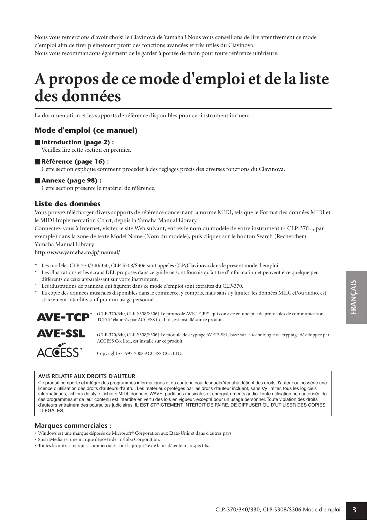 * Les illustrations et les écrans DEL proposés dans ce guide ne sont fournis qu'à titre d'information et peuvent être quelque peu différents de ceux apparaissant sur votre instrument. * Les illustrations de panneau qui figurent dans ce mode d'emploi sont extraites du CLP-370. * La copie des données musicales disponibles dans le commerce, y compris, mais sans s'y limiter, les données MIDI et/ou audio, est strictement interdite, sauf pour un usage personnel. (CLP-370/340, CLP-S308/S306) Le protocole AVE-TCP™, qui consiste en une pile de protocoles de communication TCP/IP élaborés par ACCESS Co. Ltd., est installé sur ce produit.