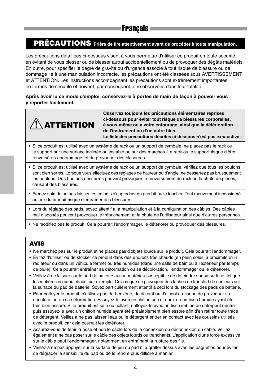 AVIS • Ne marchez pas sur le produit et ne placez pas d'objets lourds sur le produit. Cela pourrait l'endommager. • Évitez d'utiliser ou de stocker ce produit dans des endroits très chauds (en plein soleil, à proximité d'un radiateur ou dans un véhicule fermé) ou très humides (dans une salle de bain ou à l'extérieur par temps de pluie). Cela pourrait entraîner sa déformation ou sa décoloration, l'endommager ou le détériorer. • Veillez à ne laisser sur le pad de batterie aucun matériau susceptible de déteindre sur sa surface, tel que les matières en caoutchouc, par exemple. Cela risque de provoquer des taches de transfert de couleurs sur la surface du pad de batterie. Soyez particulièrement attentif à ceci lors du stockage des pads de batterie. • Pour nettoyer le produit, n'utilisez pas de benzène, de diluant ou d'alcool au risque de provoquer sa décoloration ou sa déformation. Essuyez-le avec un chiffon sec et doux ou un tissu humide ayant été très bien essoré. Si le produit est sale ou collant, nettoyez-le avec un tissu imbibé de détergent neutre puis essuyez-le avec un chiffon humide ayant été préalablement bien essoré afin d'en retirer toute trace de détergent. Veillez à ne pas laisser l'eau ou le détergent entrer en contact avec les coussins utilisés avec le produit, car cela pourrait les détériorer. • Assurez-vous de tenir la prise et non le câble lors de la connexion ou déconnexion du câble. Veillez également à ne pas poser sur le câble des objets lourds ou tranchants. L'application d'une force excessive sur le câble peut l'endommager, notamment en entraînant la rupture des fils. • Veillez à ne pas appuyer sur la surface de jeu du pad ni à gratter dessus avec les baguettes pour éviter de dégrader la sensibilité du pad ou de le rendre plus difficile à manier.