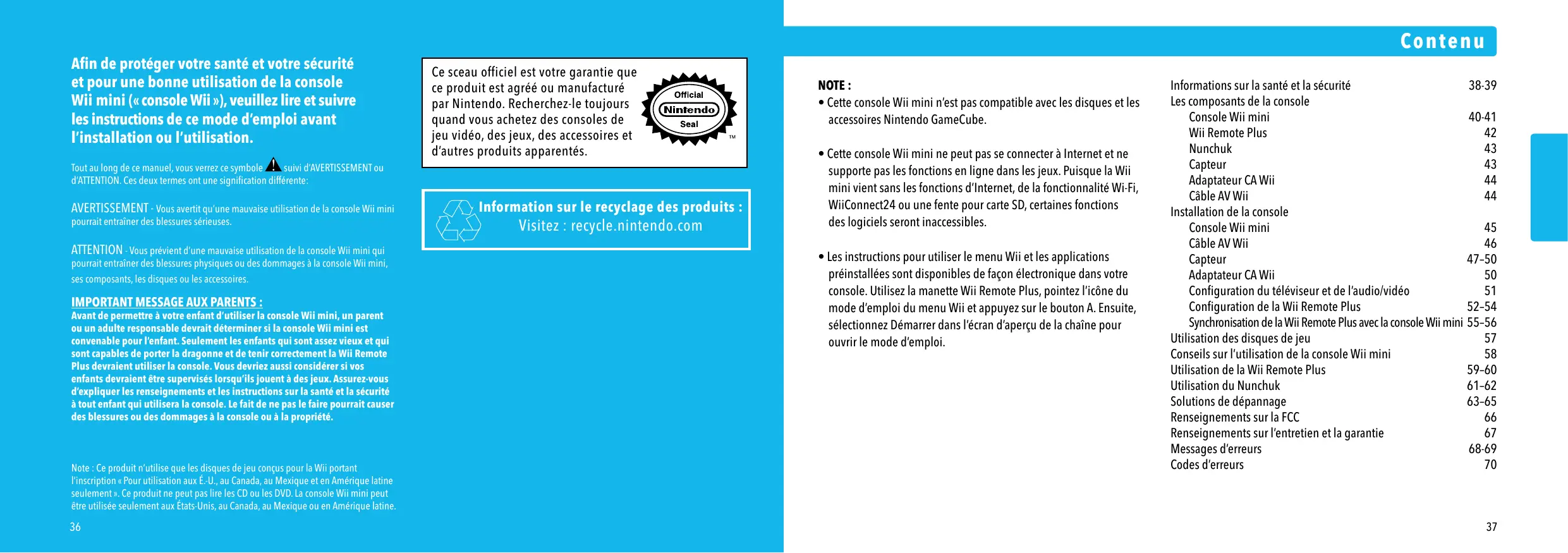 Afin de protégger votre santé et votre sécurité et pour une bonne utilisation de la console Wii mini (« console Wii »), veuilles lire et suivre les instructions de ce mode d'emploi avant l'installation ou l'utilisation.