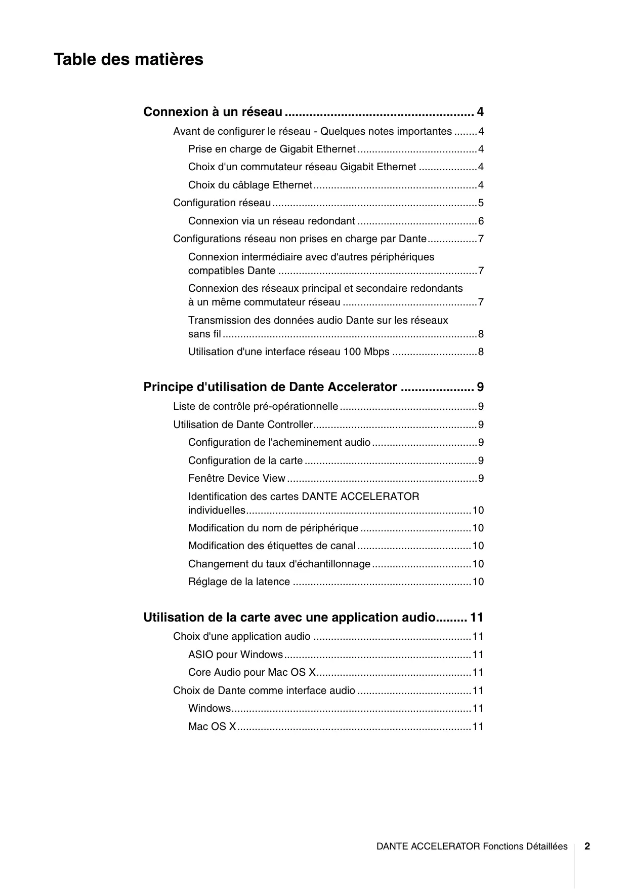 Table des matières Connexion à un réseau Avant de configurer le réseau - Quelques notes importantes Prise en charge de Gigabit Ethernet. Choix d'un commutateur réseau Gigabit Ethernet Choix du câblage Ethernet Configuration réseau Connexion via un réseau redondant Configurations réseau non prises en charge par Dante Connexion intermédiaire avec d'autres périphériques compatibles Dante Connexion des réseaux principal et secondaire redondants à un même commutateur réseau … Transmission des données audio Dante sur les réseaux sans fil. Principe d'utilisation de Dante Accelerator 9 Liste de contrôle pré-opérationnelle Utilisation de Dante Controller Configuration de l'acheminement audio …. Configuration de la carte Fenêtre Device View Identification des cartes DANTE ACCELERATOR individuelles Modification du nom de périphérique Modification des étiquettes de canal. Changement du taux d'échantillonnage …. Réglage de la latence … Utilisation de la carte avec une application audio... 11 Choix d'une application audio ASIO pour Windows. Core Audio pour Mac OS X Choix de Dante comme interface audio Windows. Mac OS X DANTE ACCELERATOR Fonctions Détaillées
