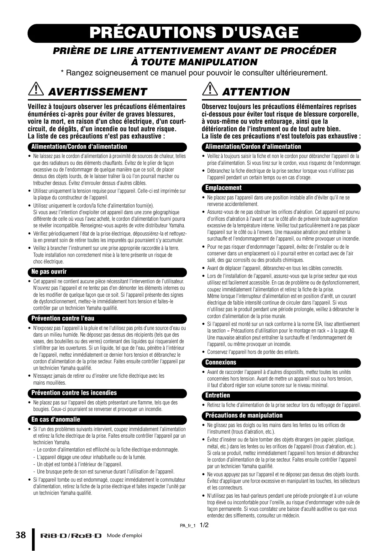 MODE D'EMPLOI RI8-D/RO8-D YAMAHA