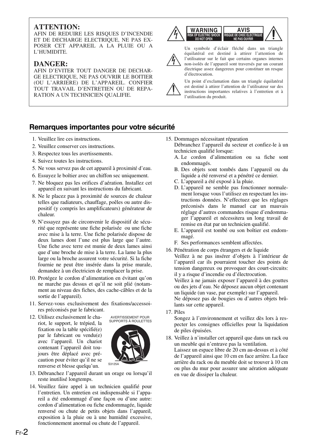 Veuillez conserver ces instructions. Respectez tous les avertissements. Suivez toutes les instructions. Ne vous servez pas de cet appareil à proximité d’eau. Essuyez le boîtier avec un chiffon sec uniquement. Ne bloquez pas les orifices d’aération. Installez cet appareil en suivant les instructions du fabricant. Ne le placez pas à proximité de sources de chaleur telles que radiateurs, chauffage, poêles ou autre dispositif (y compris les amplificateurs) générateur de chaleur. N’essayez pas de circonvenir le dispositif de sécurité que représente une fiche polarisée ou une fiche avec mise à la terre. Une fiche polarisée dispose de deux lames dont l’une est plus large que l’autre. Une fiche avec terre est munie de deux lames ainsi que d’une broche de mise à la terre. La lame la plus large ou la broche assurent votre sécurité. Si la fiche fournie ne peut être insérée dans la prise murale, demandez à un électricien de remplacer la prise. Protégez le cordon d’alimentation en évitant qu’on ne marche pas dessus et qu’il ne soit plié (notamment au niveau des fiches, des cache-câbles et de la sortie de l’appareil). Servez-vous exclusivement des fixations/accessoires préconisés par le fabricant. AVERTISSEMENT POUR Utilisez exclusivement le chariot, le support, le trépied, la SUPPORTS À ROULETTES fixation ou la table spécifié(e) par le fabricant ou vendu(e) avec l’appareil. Un chariot contenant l’appareil doit toujours être déplacé avec précaution pour éviter qu’il ne se S3125A renverse et blesse quelqu’un. Débranchez l’appareil durant un orage ou lorsqu’il reste inutilisé longtemps. Veuillez faire appel à un technicien qualifié pour l’entretien. Un entretien est indispensable si l’appareil a été endommagé d’une façon ou d’une autre: cordon d’alimentation ou fiche endommagée, liquide renversé ou chute de petits objets dans l’appareil, exposition à la pluie ou à une humidité excessive, fonctionnement anormal ou chute de l’appareil.