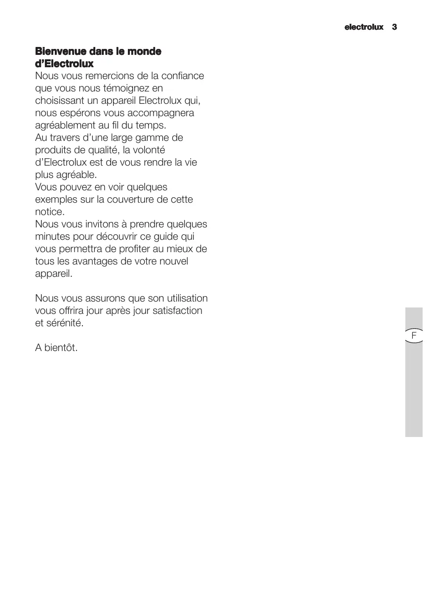 Bienvenue dans le monde d’Electr olux d’Electrolux Nous vous remercions de la confiance que vous nous témoignez en choisissant un appareil Electrolux qui, nous espérons vous accompagnera agréablement au fil du temps. Au travers d’une large gamme de produits de qualité, la volonté d’Electrolux est de vous rendre la vie plus agréable. Vous pouvez en voir quelques exemples sur la couverture de cette notice. Nous vous invitons à prendre quelques minutes pour découvrir ce guide qui vous permettra de profiter au mieux de tous les avantages de votre nouvel appareil. Nous vous assurons que son utilisation vous offrira jour après jour satisfaction et sérénité.