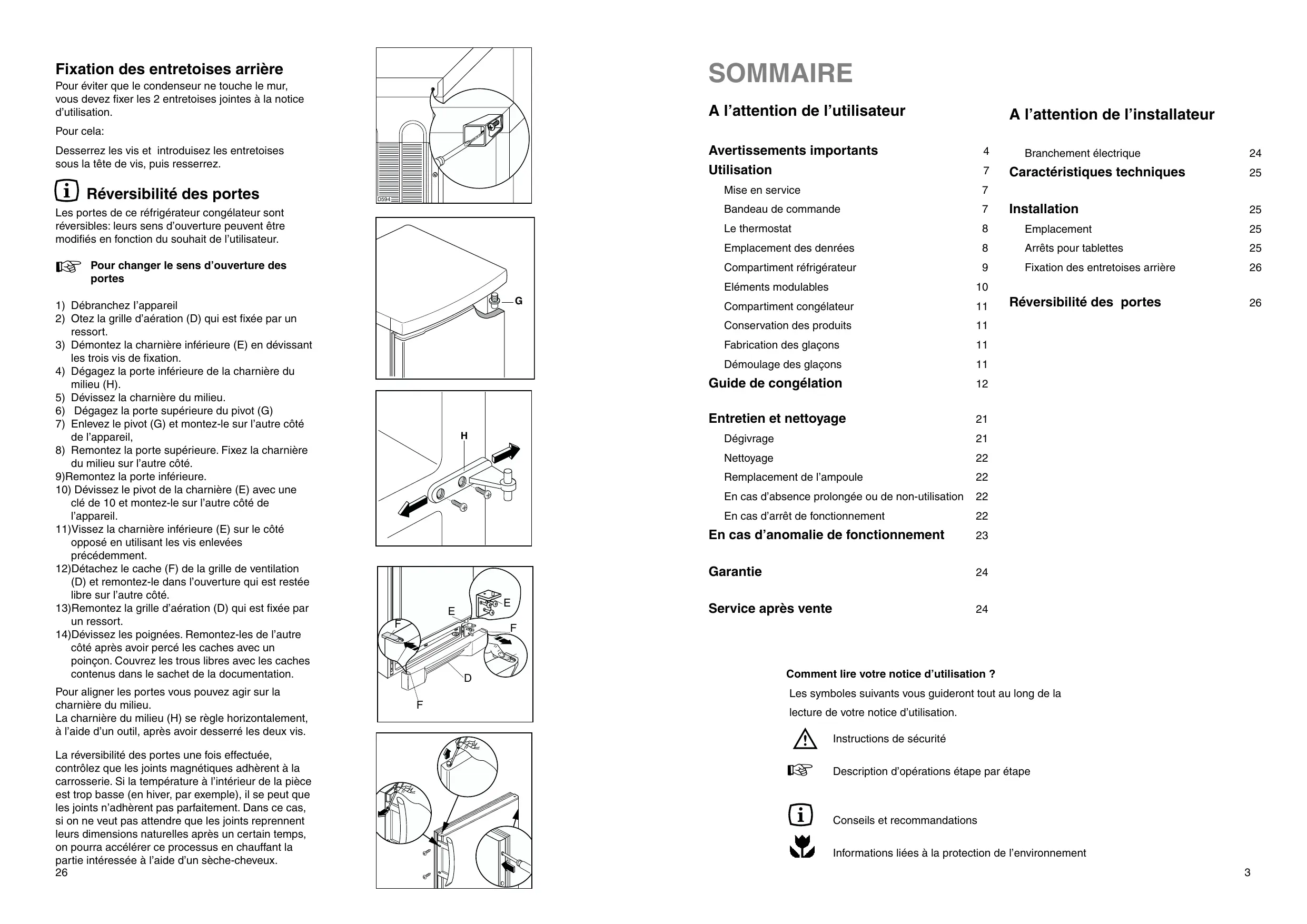 SOMMAIRE Fixation des entretoises arrière Pour éviter que le condenseur ne touche le mur, vous devez fixer les 2 entretoises jointes à la notice d’utilisation. A l’attention de l’utilisateur A l’attention de l’installateur Pour cela: Avertissements importants Utilisation Desserrez les vis et introduisez les entretoises sous la tête de vis, puis resserrez. Réversibilité des portes Pour changer le sens d’ouverture des portes
