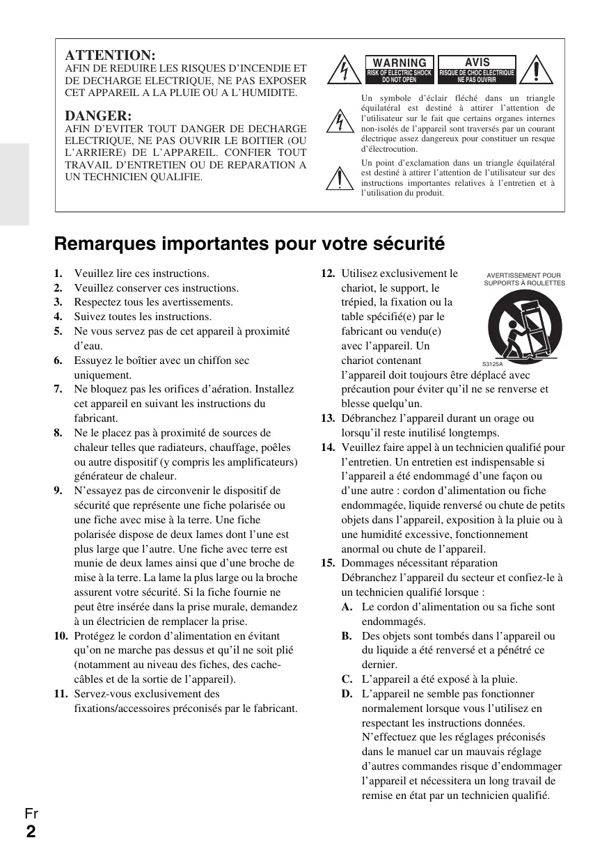 AVERTISSEMENT POUR SUPPORTS À ROULETTES chariot, le support, le trépied, la fixation ou la table spécifié(e) par le fabricant ou vendu(e) avec l’appareil. Un chariot contenant S3125A l’appareil doit toujours être déplacé avec précaution pour éviter qu’il ne se renverse et blesse quelqu’un.