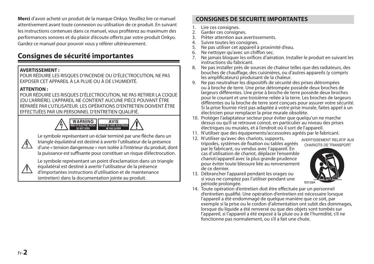 Merci d’avoir acheté un produit de la marque Onkyo. Veuillez lire ce manuel attentivement avant toute connexion ou utilisation de ce produit. En suivant les instructions contenues dans ce manuel, vous profiterez au maximum des performances sonores et du plaisir d’écoute offerts par votre produit Onkyo. Gardez ce manuel pour pouvoir vous y référer ultérieurement. Consignes de sécurité importantes