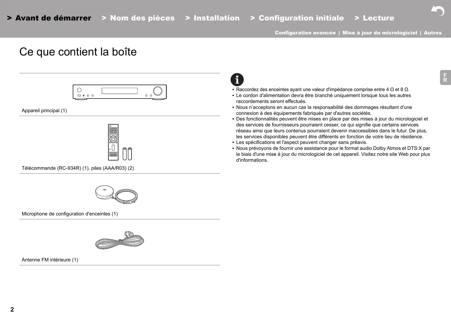 Ce que contient la boîte 2 Nom des pièces Panneau frontal 3 Panneau arrière 4 Télécommande 5 Afficheur 6 Installation 1. Raccorder les enceintes 7 2. Raccorder le téléviseur 10 3. Raccorder les appareils AV HDMI 11 4. Raccorder les Appareils Audio 12 5. Raccorder d'autres câbles 13 Configuration initiale Configuration initiale avec l'assistant de démarrage automatique 14 Lecture Lecture d'un appareil AV 17 Radio Internet 18 Spotify 19 Music Server 20 Périphérique de stockage USB 22 AirPlay® 24 Lecture BLUETOOTH® 25 Écoute de la radio FM 26 Modes d'écoute 28 Menu Rapide 46 Autres fonctions 48 Configuration avancée Menu configuration 49 Mise à jour du micrologiciel Mise à jour du micrologiciel 62 Autres Dépannage 65 Caractéristiques générales 70 À propos de l’interface HDMI 72 Informations relatives à la licence et à la marque commerciale 73