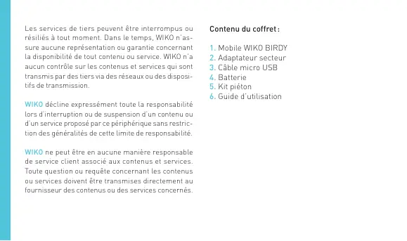 SPECIAUX, DES HONORAIRES D’AVOCAT, DES FRAIS OU DE TOUT AUTRE DOMMAGE RÉSULTANT DE L’UTILISATION DES CONTENUS OU SERVICES PAR VOUS-MÊME OU PAR UN TIERS MÊME SI WIKO A ÉTÉ INFORMÉ DE LA POSSIBILITÉ DE TELS DÉSAGRÉMENTS. CERTAINS PAYS N’AUTORISENT PAS L’EXCLUSION DES GARANTIES IMPLICITES OU LA LIMITATION DES DROITS LÉGAUX DU CONSOMMATEUR, IL SE PEUT QUE CES EXCLUSIONS ET LIMITATIONS NE VOUS SOIENT PAS APPLICABLES. Les services de tiers peuvent être interrompus ou résiliés à tout moment. Dans le temps, WIKO n’assure aucune représentation ou garantie concernant la disponibilité de tout contenu ou service. WIKO n’a aucun contrôle sur les contenus et services qui sont transmis par des tiers via des réseaux ou des dispositifs de transmission. WIKO décline expressément toute la responsabilité lors d’interruption ou de suspension d’un contenu ou d’un service proposé par ce périphérique sans restriction des généralités de cette limite de responsabilité. WIKO ne peut être en aucune manière responsable de service client associé aux contenus et services. Toute question ou requête concernant les contenus ou services doivent être transmises directement au fournisseur des contenus ou des services concernés. Contenu du coffret :