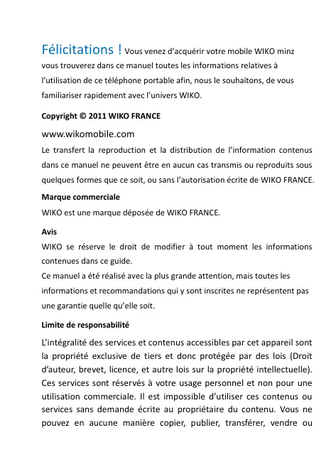 Félicitations ! Vous venez d’acquérir votre mobile WIKO minz vous trouverez dans ce manuel toutes les informations relatives à l’utilisation de ce téléphone portable afin, nous le souhaitons, de vous familiariser rapidement avec l’univers WIKO. Copyright © 2011 WIKO FRANCE www.wikomobile.com Le transfert la reproduction et la distribution de l’information contenus dans ce manuel ne peuvent être en aucun cas transmis ou reproduits sous quelques formes que ce soit, ou sans l’autorisation écrite de WIKO FRANCE. Marque commerciale WIKO est une marque déposée de WIKO FRANCE. Avis WIKO se réserve le droit de modifier à tout moment les informations contenues dans ce guide. Ce manuel a été réalisé avec la plus grande attention, mais toutes les informations et recommandations qui y sont inscrites ne représentent pas une garantie quelle qu’elle soit. Limite de responsabilité L’intégralité des services et contenus accessibles par cet appareil sont la propriété exclusive de tiers et donc protégée par des lois (Droit d’auteur, brevet, licence, et autre lois sur la propriété intellectuelle). Ces services sont réservés à votre usage personnel et non pour une utilisation commerciale. Il est impossible d’utiliser ces contenus ou services sans demande écrite au propriétaire du contenu. Vous ne pouvez en aucune manière copier, publier, transférer, vendre ou exploiter sur quelque support que ce soit des contenus ou des services édités par le biais de cet appareil ou d’en produire des formes dérivées. LES SERVICES ET CONTENUS DES TIERS SONT DELIVRÉS « EN L’ÉTAT ». WIKO FRANCE NE GARANTIT PAS LES CONTENUS OU SERVICES AINSI DELIVRÉS, QUE CE SOIT DE MANIERE EXPRESSE OU IMPLICITE, A QUELQUE FIN QUE CE SOIT AINSI QUE LES GARANTIES QUALITÉ MARCHANDE ET D’ADÉQUATION A UN USAGE PARTICULIER. WIKO FRANCE N’ASSURE PAS LA GARANTIE DE L’EXACTITUDE, LA VALIDITÉ, LA LÉGALITE OU L’EXHAUSTIVITE DES CONTENUS OU SERVICES FOURNIS PAR CET APPAREIL. WIKO FRANCE NE SERA PAS RESPONSABLE EN CAS DE NÉGLIGENCE, QUE CE SOIT AU NIVEAU DE LA RESPONSABILITÉ CONTRACTUELLE OU DÉLICTUELLE, DES DOMMAGES DIRECTS OU INDIRECTS, ACCESSOIRES SPECIAUX OU CONSÉCUTIFS DES HONORAIRES D’AVOCAT, DES FRAIS OU DE TOUT AUTRE DOMMAGE RÉSULTANT DE L’UTILISATION DE TOUT CONTENU OU SERVICE PAR VOUS-MÊME OU PAR UN TIERS MÊME SI WIKO FRANCE A ÉTÉ INFORMÉ DE LA POSSIBILITÉ DE TELS DÉSAGRÉMENTS. CERTAINS PAYS N’AUTORISENT PAS L’EXCLUSION DES GARANTIES IMPLICITES OU LA LIMITATION DES DROITS LÉGAUX DU CONSOMMATEUR, IL SE PEUT QUE CES EXCLUSIONS ET LIMITATIONS NE VOUS SOIENT PAS APPLICABLES. Les services de tiers peuvent être interrompus ou résiliés à tout moment. Dans le temps, WIKO FRANCE n’assure aucune représentation ou garantie concernant la disponibilité de tout contenu ou service. WIKO FRANCE n’a aucun contrôle sur les contenus et services qui sont transmis par des tiers via des réseaux ou des dispositifs de transmission. WIKO FRANCE décline expressément toute la responsabilité lors d’interruption ou de suspension d’un contenu ou d’un service proposé par ce périphérique sans restriction des généralités de cette limite de responsabilité. WIKO FRANCE ne peut être en aucune manière responsable de service client associé aux contenus et services. Toute question ou requête concernant les contenus ou services doivent être transmises directement au fournisseur des contenus ou des services concernés. Contenu du coffret Mobile WIKO minz Adaptateur secteur Câble micro USB Batterie Écouteur avec micro Manuel d’utilisation Carte de garantie WIKO minz 01 Découvrir votre téléphone Manuel d’utilisation 1 WIKO minz