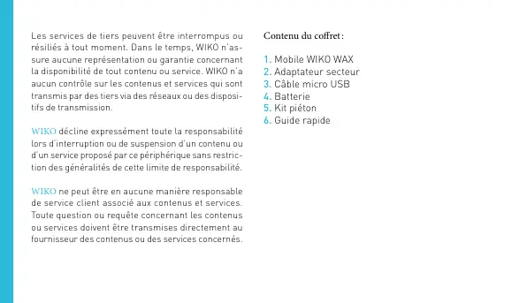 Guide rapide Quick guide guida rapida Guía rápida guia rápido kurzanleitung snelstartgids Guide rapide Le descriptif de ce guide peut contenir certaines différences avec celui de votre téléphone en fonction de la version du logiciel ou de votre opérateur. FÉLICITATIONS ! Vous venez d’acquérir votre mobile WIKO WAX. Vous trouverez dans ce guide toutes les informations relatives à l’utilisation de ce téléphone portable afin, nous le souhaitons, de vous familiariser rapidement avec l’univers WIKO. Copyright © 2014 WIKO www.wikomobile.com Le transfert, la reproduction et la distribution de l’information contenus dans ce manuel ne peuvent être en aucun cas transmis ou reproduits sous quelques formes que ce soit, ou sans l’autorisation écrite de WIKO. Marques commerciales WIKO est une marque déposée de WIKO. Avis WIKO se réserve le droit de modifier à tout moment les informations contenues dans ce guide. Ce guide a été réalisé avec la plus grande attention, mais toutes les informations et recommandations qui y sont inscrites ne représentent pas une garantie quelle qu’elle soit. Limite de responsabilité L’intégralité des services et contenus accessibles par cet appareil sont la propriété exclusive de tiers et donc protégée par des lois (Droit d’auteur, brevet, licence, et autre lois sur la propriété intellectuelle). Ces services sont réservés à votre usage personnel et non pour une utilisation commerciale. Il est impossible d’utiliser ces contenus ou services sans demande écrite au propriétaire du contenu. Vous ne pouvez en aucune manière copier, publier, transférer, vendre ou exploiter sur quelque support que ce soit des contenus ou des services édités par le biais de cet appareil ou d’en produire des formes dérivées. LES SERVICES ET CONTENUS DES TIERS SONT DELIVRÉS «EN L’ÉTAT». WIKO NE GARANTIT PAS LES CONTENUS OU SERVICES AINSI DELIVRÉS, QUE CE SOIT DE MANIERE EXPRESSE OU IMPLICITE, A QUELQUE FIN QUE CE SOIT AINSI QUE LES GARANTIES QUALITÉ MARCHANDE ET D’ADÉQUATION A UN USAGE PARTICULIER. WIKO N’ASSURE PAS LA GARANTIE DE L’EXACTITUDE, LA VALIDITÉ, LA LÉGALITE OU L’EXHAUSTIVITE DES CONTENUS OU SERVICES FOURNIS PAR CET APPAREIL. WIKO NE SERA PAS RESPONSABLE EN CAS DE NÉGLIGENCE, QUE CE SOIT AU NIVEAU DE LA RESPONSABILITÉ CONTRACTUELLE OU DÉLICTUELLE, DES DOMMAGES DIRECTS OU INDIRECTS, ACCESSOIRES SPECIAUX, DES HONORAIRES D’AVOCAT, DES FRAIS OU DE TOUT AUTRE DOMMAGE RÉSULTANT DE L’UTILISATION DES CONTENUS OU SERVICES PAR VOUS-MÊME OU PAR UN TIERS MÊME SI WIKO A ÉTÉ INFORMÉ DE LA POSSIBILITÉ DE TELS DÉSAGRÉMENTS. CERTAINS PAYS N’AUTORISENT PAS L’EXCLUSION DES GARAN- TIES IMPLICITES OU LA LIMITATION DES DROITS LÉGAUX DU CONSOMMATEUR, IL SE PEUT QUE CES EXCLUSIONS ET LIMITATIONS NE VOUS SOIENT PAS APPLICABLES. Les services de tiers peuvent être interrompus ou résiliés à tout moment. Dans le temps, WIKO n’assure aucune représentation ou garantie concernant la disponibilité de tout contenu ou service. WIKO n’a aucun contrôle sur les contenus et services qui sont transmis par des tiers via des réseaux ou des dispositifs de transmission. WIKO décline expressément toute la responsabilité lors d’interruption ou de suspension d’un contenu ou d’un service proposé par ce périphérique sans restriction des généralités de cette limite de responsabilité. WIKO ne peut être en aucune manière responsable de service client associé aux contenus et services. Toute question ou requête concernant les contenus ou services doivent être transmises directement au fournisseur des contenus ou des services concernés. Contenu du coffret :