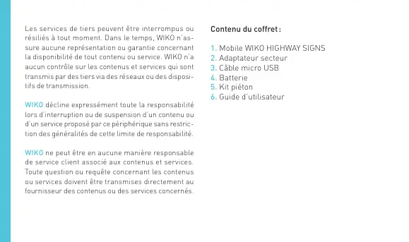 Les services de tiers peuvent être interrompus ou résilés à tout moment, Dans Le temp, WIKO n'as sure aucune représentation ou garantie concernant La disponibilité de eut contenu ou service. MIKO n'a aucun contrôle sur les contenus et services qui sont Lranamis par des bars via des réseaux ou des dispose sde tranemission. WIKO décline expressément toute La responsabilité Lors d'interruption ou de suspension un contenu ou d'un service proposé par ce périphérique sans restric- Lion es généralités de cete limite de responsabilité. WIKO ne peut être en aucune manière responsable de semice client associé aux contenus et services, Toute question au requête concernant les contenus ou services doivent être transmises directement au fournisseur des contenus ou des serres concernés, Contenu du coffret:
