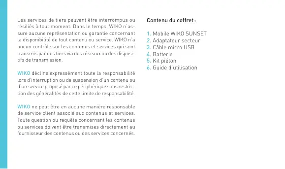 SPECIAUX, DES HONORAIRES D’AVOCAT, DES FRAIS OU DE TOUT AUTRE DOMMAGE RÉSULTANT DE L’UTILISATION DES CONTENUS OU SERVICES PAR VOUS-MÊME OU PAR UN TIERS MÊME SI WIKO A ÉTÉ INFORMÉ DE LA POSSIBILITÉ DE TELS DÉSAGRÉMENTS. CERTAINS PAYS N’AUTORISENT PAS L’EXCLUSION DES GARANTIES IMPLICITES OU LA LIMITATION DES DROITS LÉGAUX DU CONSOMMATEUR, IL SE PEUT QUE CES EXCLUSIONS ET LIMITATIONS NE VOUS SOIENT PAS APPLICABLES. Les services de tiers peuvent être interrompus ou résiliés à tout moment. Dans le temps, WIKO n’assure aucune représentation ou garantie concernant la disponibilité de tout contenu ou service. WIKO n’a aucun contrôle sur les contenus et services qui sont transmis par des tiers via des réseaux ou des dispositifs de transmission. WIKO décline expressément toute la responsabilité lors d’interruption ou de suspension d’un contenu ou d’un service proposé par ce périphérique sans restriction des généralités de cette limite de responsabilité. WIKO ne peut être en aucune manière responsable de service client associé aux contenus et services. Toute question ou requête concernant les contenus ou services doivent être transmises directement au fournisseur des contenus ou des services concernés. Contenu du coffret :