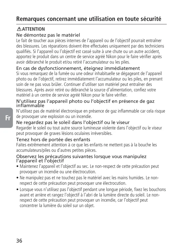 ATTENTION Ne démontez pas le matériel Le fait de toucher aux pièces internes de l’appareil ou de l’objectif pourrait entraîner des blessures. Les réparations doivent être effectuées uniquement par des techniciens qualifiés. Si l’appareil ou l’objectif est cassé suite à une chute ou un autre accident, apportez le produit dans un centre de service agréé Nikon pour le faire vérifier après avoir débranché le produit et/ou retiré l'accumulateur ou les piles. En cas de dysfonctionnement, éteignez immédiatement Si vous remarquez de la fumée ou une odeur inhabituelle se dégageant de l’appareil photo ou de l’objectif, retirez immédiatement l’accumulateur ou les piles, en prenant soin de ne pas vous brûler. Continuer d’utiliser son matériel peut entraîner des blessures. Après avoir retiré ou débranché la source d’alimentation, confiez votre matériel à un centre de service agréé Nikon pour le faire vérifier. N’utilisez pas l’appareil photo ou l’objectif en présence de gaz inflammable N’utilisez pas de matériel électronique en présence de gaz inflammable car cela risque de provoquer une explosion ou un incendie. Ne regardez pas le soleil dans l’objectif ou le viseur Regarder le soleil ou tout autre source lumineuse violente dans l’objectif ou le viseur peut provoquer de graves lésions oculaires irréversibles. Tenez hors de portée des enfants Faites extrêmement attention à ce que les enfants ne mettent pas à la bouche les accumulateurs/piles ou d’autres petites pièces. Observez les précautions suivantes lorsque vous manipulez l’appareil et l’objectif • Maintenez l’appareil et l’objectif au sec. Le non-respect de cette précaution peut provoquer un incendie ou une électrocution. • Ne manipulez pas et ne touchez pas le matériel avec les mains humides. Le nonrespect de cette précaution peut provoquer une électrocution. • Lorsque vous n’utilisez pas l’objectif pendant une longue période, fixez les bouchons avant et arrière et rangez l’objectif à l’abri de la lumière directe du soleil. Le nonrespect de cette précaution peut provoquer un incendie, car l’objectif peut concentrer la lumière du soleil sur un objet.