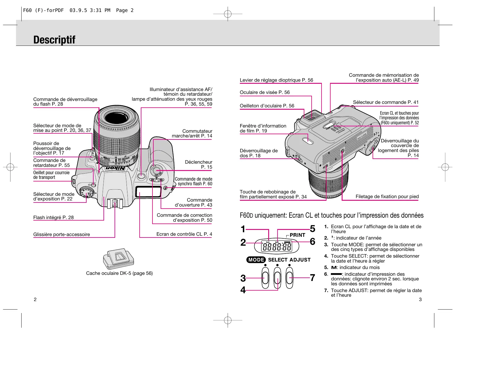 Commutateur marche/arrêt P. 14 Oculaire de visée P. 56 Touche de rebobinage de film partiellement exposé P. 34 Filetage de fixation pour pied Commande de correction d’exposition P. 50 F60D uniquement: Ecran CL et touches pour l’impression des données Ecran de contrôle CL P. 4