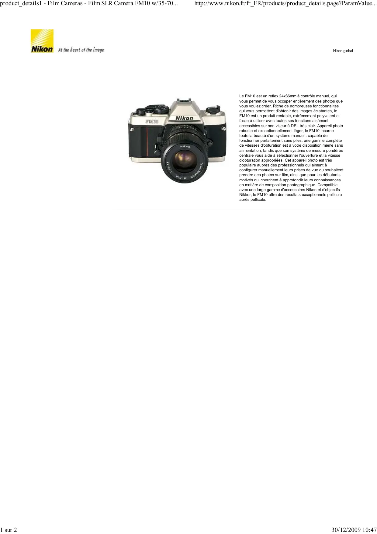 FM10 - Appareil photo argentique NIKON - Notice d'utilisation et mode d'emploi gratuit