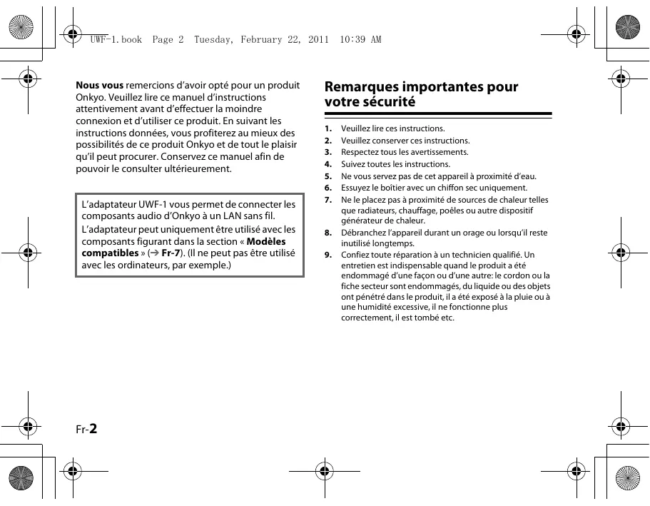 Par la présente, ONKYO SOUND & VISION CORPORATION déclare que l’appareil UWF-1 est conforme aux exigences essentielles et aux autres dispositions pertinentes de la directive 1999/5/CE.