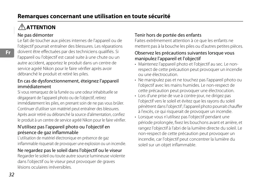 ATTENTION Ne pas démonter Tenir hors de portée des enfants Le fait de toucher aux pièces internes de l'appareil ou de l'objectif pourrait entraîner des blessures. Les réparations doivent être effectuées par des techniciens qualifiés. Si l'appareil ou l'objectif est cassé suite à une chute ou un autre accident, apportez le produit dans un centre de service agréé Nikon pour le faire vérifier après avoir débranché le produit et retiré les piles. Faites extrêmement attention à ce que les enfants ne mettent pas à la bouche les piles ou d'autres petites pièces. En cas de dysfonctionnement, éteignez l'appareil immédiatement Si vous remarquez de la fumée ou une odeur inhabituelle se dégageant de l'appareil photo ou de l'objectif, retirez immédiatement les piles, en prenant soin de ne pas vous brûler. Continuer d'utiliser son matériel peut entraîner des blessures. Après avoir retiré ou débranché la source d'alimentation, confiez le produit à un centre de service agréé Nikon pour le faire vérifier. N'utilisez pas l'appareil photo ou l'objectif en présence de gaz inflammable L'utilisation de matériel électronique en présence de gaz inflammable risquerait de provoquer une explosion ou un incendie. Ne regardez pas le soleil dans l'objectif ou le viseur Regarder le soleil ou toute autre source lumineuse violente dans l'objectif ou le viseur peut provoquer de graves lésions oculaires irréversibles.