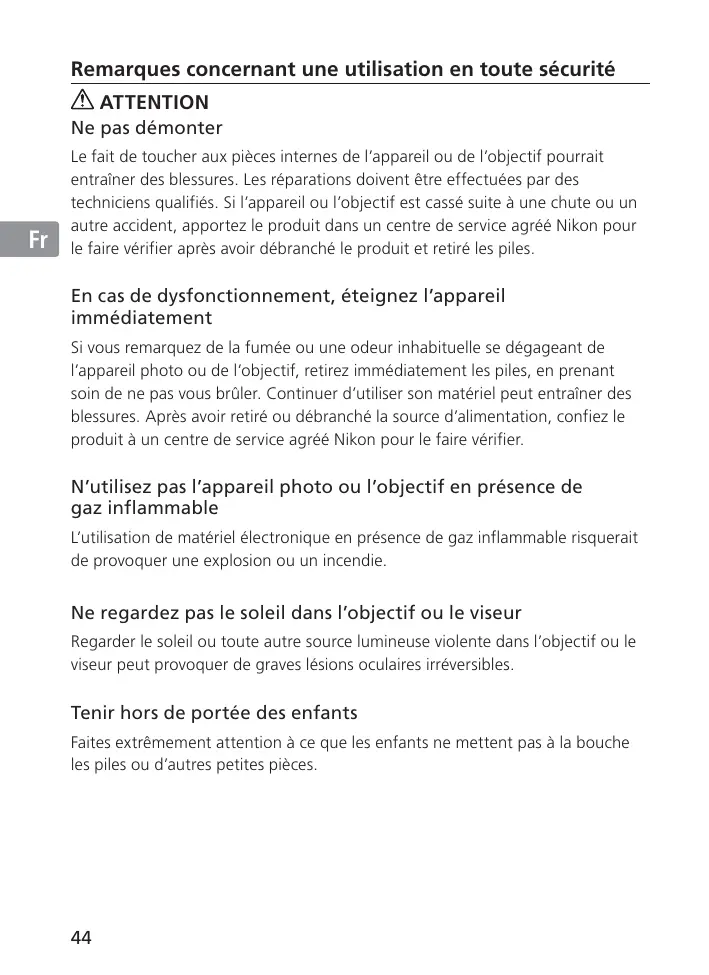 Si vous remarquez de la fumée ou une odeur inhabituelle se dégageant de l’appareil photo ou de l’objectif, retirez immédiatement les piles, en prenant soin de ne pas vous brûler. Continuer d’utiliser son matériel peut entraîner des blessures. Après avoir retiré ou débranché la source d’alimentation, confiez le produit à un centre de service agréé Nikon pour le faire vérifier.