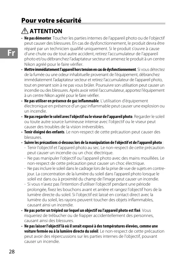 De Fr Es AF-S NIKKOR 85mm f/1.4G Sv Ru De Fr Es Sv Ru De Fr Es Sv Ru De Fr Es Sv Ru De Fr Es Sv Ru De ◎ ◎ — ◎ — — — — — ◎ ◎ ◎ F6 F5+DP-30 De Fr Es Sv Ru De Fr Es Sv Ru De Fr Es Sv Ru De Fr Es Sv Ru De Fr Es Sv Ru De Fr Es Sv Ru De Fr Es Sv Ru De Fr Es Sv Ru De Fr Es Sv Ru De Fr Es Sv Ru De Fr Es Sv Ru De Fr Es Sv Ru De Fr Es Sv Ru De Fr Es Sv Ru De Fr Es Sv Ru De Fr Es Sv Ru De Fr Es Sv Ru De Fr Es Sv Ru De Fr Es Sv Ru Nikon agréé pour le faire vérifier. • Mettre immédiatement l’appareil hors tension en cas de dysfonctionnement. Si vous détectez de la fumée ou une odeur inhabituelle provenant de l’équipement, débranchez immédiatement l’adaptateur secteur et retirez l’accumulateur de l’appareil photo, tout en prenant soin à ne pas vous brûler. Poursuivre son utilisation peut causer un incendie ou des blessures. Après avoir retiré l’accumulateur, apportez l’équipement à un centre Nikon agréé pour le faire vérifier. • Ne pas utiliser en présence de gaz inflammable. L’utilisation d’équipement électronique en présence d’un gaz inflammable peut causer une explosion ou un incendie. • Ne pas regarder le soleil avec l’objectif ou le viseur de l’appareil photo. Regarder le soleil ou toute autre source lumineuse intense avec l’objectif ou le viseur peut causer des troubles de la vision irréversibles. • Tenir éloigné des enfants. Le non-respect de cette précaution peut causer des blessures. • Suivre les précautions ci-dessous lors de la manipulation de l’objectif et de l’appareil photo : - Tenir l’objectif et l’appareil photo au sec. Le non-respect de cette précaution peut causer un incendie ou un choc électrique. - Ne pas manipuler l’objectif ou l’appareil photo avec des mains mouillées. Le non-respect de cette précaution peut causer un choc électrique. - Ne pas inclure le soleil dans le cadrage lors de la prise de vue de sujets en contrejour. La concentration de la lumière du soleil dans l’appareil photo lorsque le soleil est dans ou à proximité du champ de l’image peut causer un incendie. - Si vous n’avez pas l’intention d’utiliser l’objectif pendant une période prolongée, fixez les bouchons avant et arrière et rangez l’objectif hors de la lumière directe du soleil. Si l’objectif est laissé en contact direct avec la lumière du soleil, les rayons peuvent toucher des objets inflammables, causant ainsi un incendie. • Ne pas porter un trépied sur lequel un objectif ou l’appareil photo est fixé. Vous risqueriez de trébucher ou de frapper accidentellement des personnes, causant ainsi des blessures. • Ne pas laisser l’objectif là où il serait exposé à des températures élevées, comme une voiture fermée ou à la lumière directe du soleil. Le non-respect de cette précaution peut avoir des répercussions sur les parties internes de l’objectif, pouvant causer un incendie.
