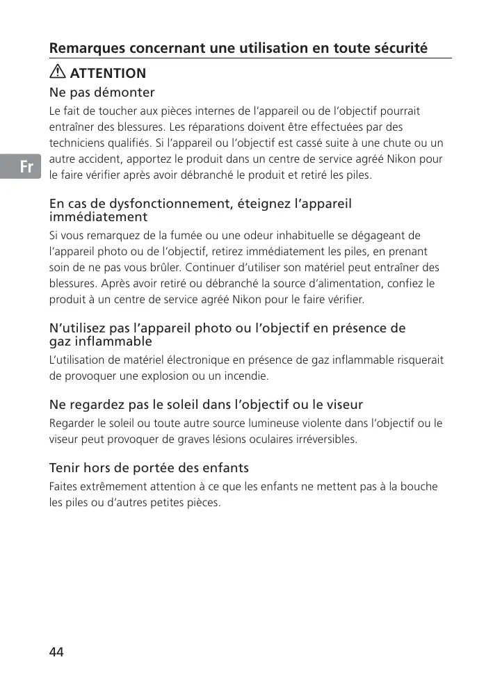 En cas de dysfonctionnement, éteignez l’appareil immédiatement Si vous remarquez de la fumée ou une odeur inhabituelle se dégageant de l’appareil photo ou de l’objectif, retirez immédiatement les piles, en prenant soin de ne pas vous brûler. Continuer d’utiliser son matériel peut entraîner des blessures. Après avoir retiré ou débranché la source d’alimentation, confiez le produit à un centre de service agréé Nikon pour le faire vérifier.