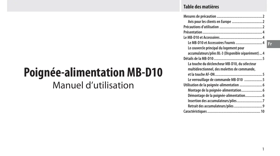 Batterien des Typs EN-EL3e, EN-EL4a und EN-EL4 Le MB-D10 et Accessoires4 Le MB-D10 et Accessoires Fournis 4 Fr Le couvercle principal du logement pour accumulateurs/piles BL-3 (Disponible séparément) ...4 Détails de la MB-D10 5 La touche du déclencheur MB-D10, du sélecteur multidirectionnel, des molettes de commande, et la touche AF-ON 5 Le verrouillage de commande MB-D10 5 Utilisation de la poignée-alimentation 6 Montage de la poignée-alimentation 6 Démontage de la poignée-alimentation6 Insertion des accumulateurs/piles7 Retrait des accumulateurs/piles 9 Caractéristiques 10