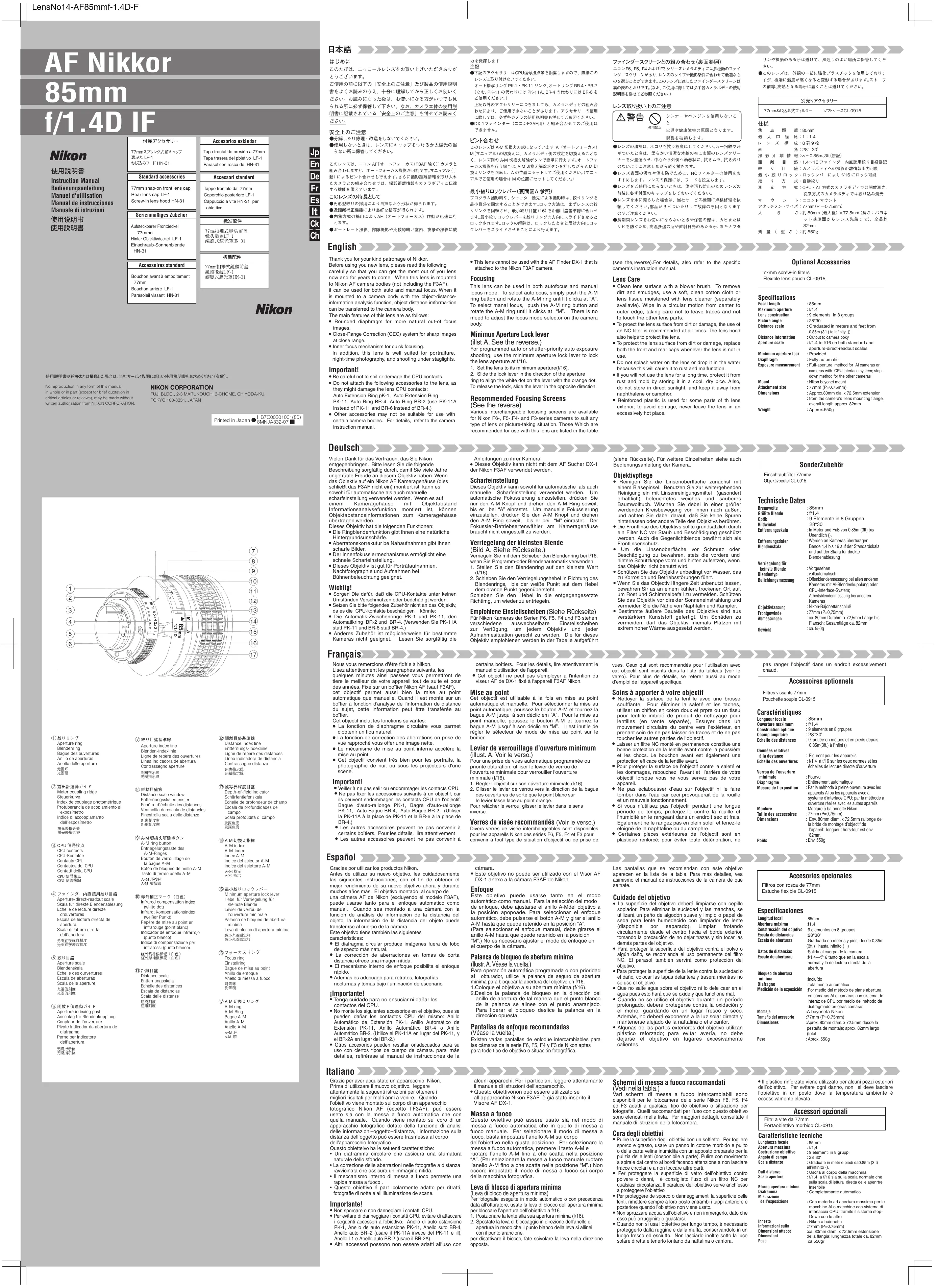 : 85mm : f/1.4 : 9 élements en 8 grpupes : 28°30' : Graduée en mètues et en pieds depuis 0.85m(3ft.) à l'infini () : Figurent pour les appareils : f/1,4 à f/16 sur les deux normes et les échelles de lecture directe d’ouverture : Pourvu : Entièrement automatique : Par la méthode à pleine ouverture avec les appareils Al ou les appareils avec à système d’interface CPU; par la méthode à ouverture réelles avec les autres apareils : Monture à baïonnette Nikon : 77mm (P=0,75mm) : Env. 80mm diam. x 72,5mm rallonge de la bride de montage d’objectif de l’apareil: longueur hors-tout est env. 82mm. : Env. 550g