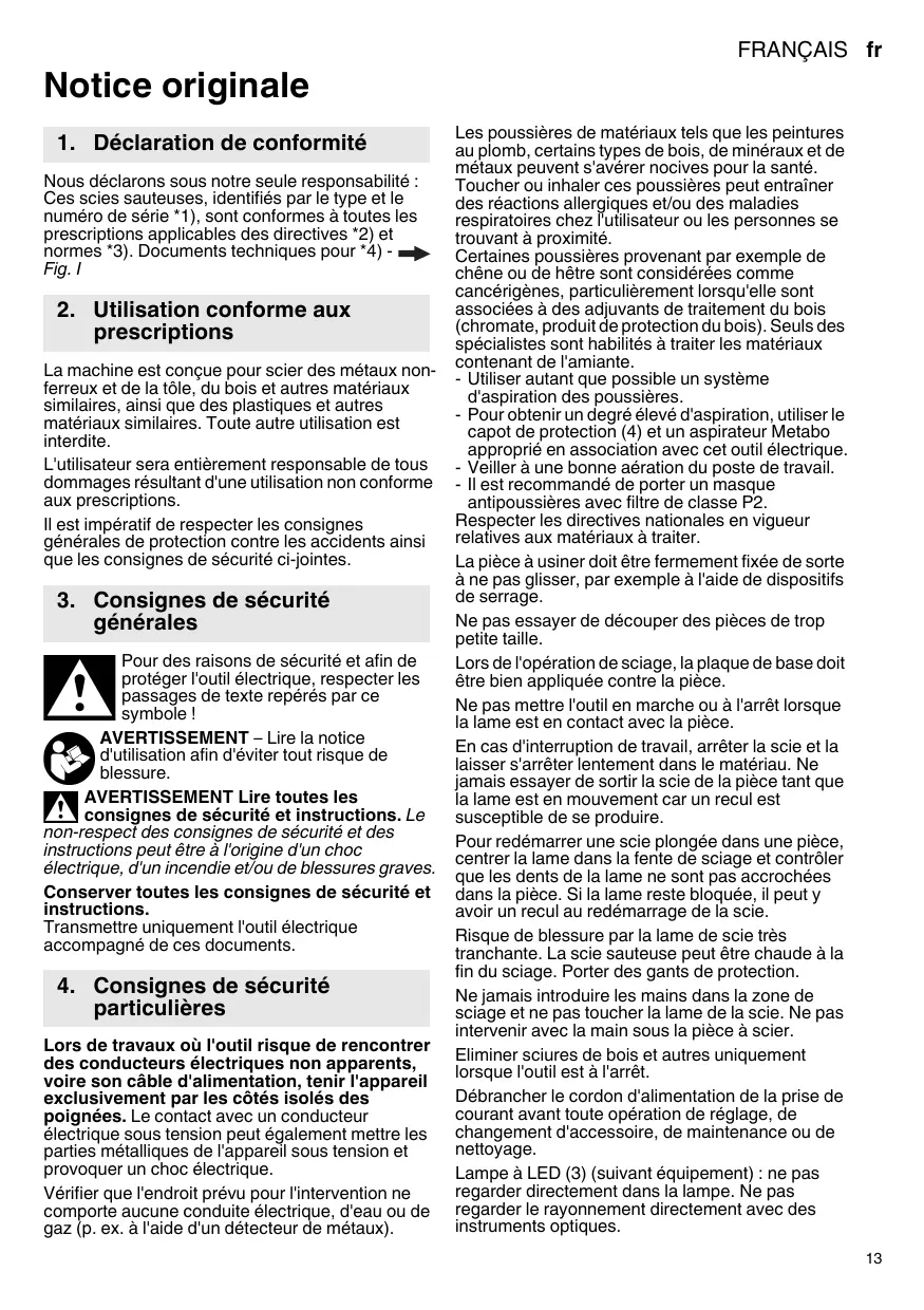 La machine est donc pour scier des métaux non-feRéaux et de la tôle, du bois et autres matériaux similaires, ainsi que des plastiques et autres matériaux similaires. Toute autre utilisation est interdite.