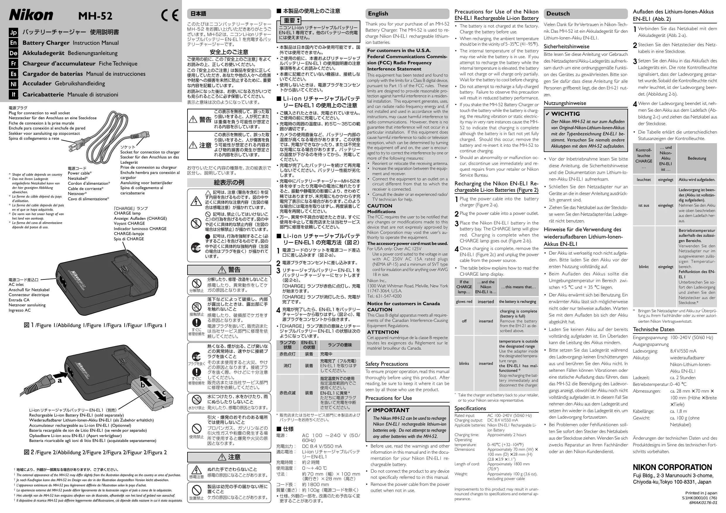 - Bringen Sie Netzadapter und Akku zur Überprüfung zu Ihrem Fachhändler oder zu einer autorisierten Nikon Vertragswerkstatt. Technische Daten Eingangsspannung: 100–240 V (50/60 Hz) Ausgangsspannung Ladevorgang: 8,4 V/550 mA Akkutyp: wiederaufladbarer Nikon-Lithium-IonenAkku EN-EL1 Ladezeit: ca. 2 Stunden Betriebstemperatur: 0–40 °C Abmessungen: ca. 28 mm × 70 mm × 100 mm (Höhe × Breite × Tiefe) Kabellänge: ca. 1,8 m Gewicht: ca. 100 g (ohne Netzkabel) Änderungen der technischen Daten und des Produktdesigns im Sinne des technischen Fortschritts vorbehalten. Printed in Japan S1HK000101 (76) 6MAK0176-01 Français Nous vous remercions d'avoir fait l'acquisition du chargeur d'accumulateur MH-52 destiné à recharger l'accumulateur Li-ion rechargeable EN-ELI. Mesures de précaution Avant d’utiliser l’alimentation secteur/ chargeur d’accumulateur EH-21et afin d’en assurer un bon fonctionnement, veuillez lire attentivement le présent manuel. Une fois ceci effectué, rangez ce manuel dans un lieu où les personnes utilisant ce produit peuvent facilement le consulter. Précautions d’utilisation ✔ IMPORTANT Le MH-52 de NIKON doit uniquement être utilisé pour recharger les accumulateurs rechargeables au Li-ion EN-EL1. N’essayez pas de recharger d’autres types d’accumulateurs avec cet appareil.