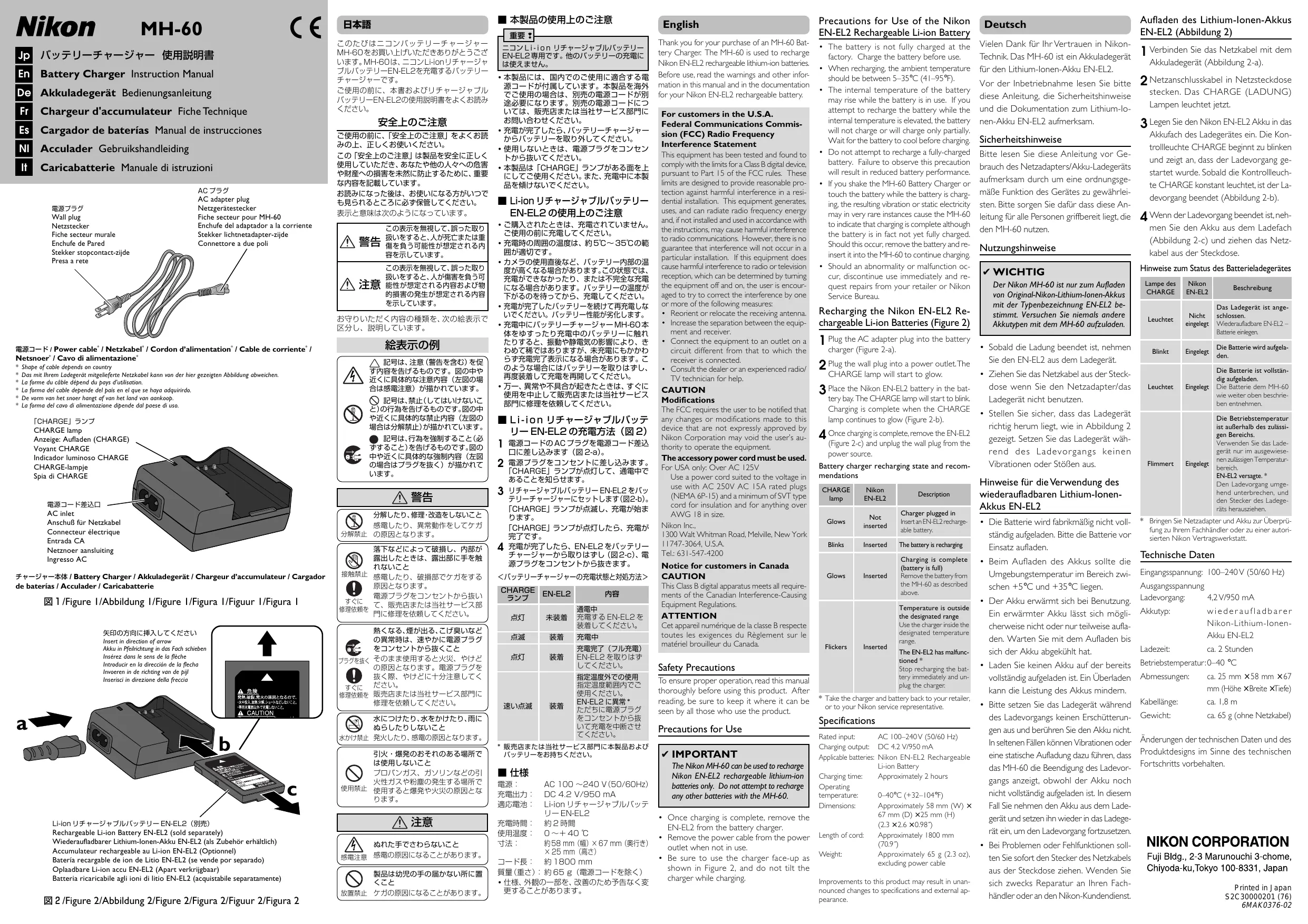 - Bei Problemen oder Fehlfunktionen sollten Sie sofort den Stecker des Netzkabels aus der Steckdose ziehen. Wenden Sie sich zwecks Reparatur an Ihren Fachhändler oder an den Nikon-Kundendienst. ca. 25 mm × 58 mm × 67 mm (Höhe × Breite × Tiefe) Kabellänge: ca. 1,8 m Gewicht: ca. 65 g (ohne Netzkabel) Änderungen der technischen Daten und des Produktdesigns im Sinne des technischen Fortschritts vorbehalten. Printed in Japan S2C30000201 (76) 6MAK0376-02 Français Nous vous remercions d'avoir fait l'acquisition du chargeur d'accumulateur MH-60 destiné à recharger l'accumulateur Li-ion rechargeable EN-EL2. Nous vous conseillons de prendre connaissance de tous les avertissements et autres informations fournis dans le présent manuel et dans la documentation relative à l'accumulateur rechargeable Nikon EN-EL2, avant d'utiliser le chargeur d'accumulateur. Mesures de précaution Comment recharger l'accumulateur Li-ion rechargeable EN-EL2 NIKON 1 Branchez le câble d'alimentation dans le chargeur d'accumulateur (Figure 2-a). 2 Branchez le câble d’alimentation dans une prise de courant. Le témoin de chargement s’allumera alors. 3 Insérez la batterie Nikon EN-EL2 dans le logement qui lui est destiné. Le voyant CHARGE se mettra à clignoter. Le chargement sera terminé lorsque ce voyant s'allumera fixement (Figure 2-b). Avant d’utiliser l’alimentation secteur/ char- 4 Dès que l'accumulateur est rechargé, enlevez l'accumulateur EN-EL2 (Figure 2-c) geur d’accumulateur MH-60 et afin d’en et débranchez le câble d'alimentation de assurer un bon fonctionnement, veuillez lire la prise de courant. attentivement le présent manuel. Une fois ceci effectué, rangez ce manuel dans un Etat du chargeur de batterie et recomlieu où les personnes utilisant ce produit mandations peuvent facilement le consulter. Voyant EN-EL2 Précautions d’utilisation ✔ IMPORTANT Le MH-60 de NIKON doit uniquement être utilisé pour recharger les accumulateurs rechargeables au Li-ion EN-EL2. N’essayez pas de recharger d’autres types d’accumulateurs avec cet appareil. CHARGE Nikon Brille N'est pas insérée Clignote Inséré Brille Inséré
