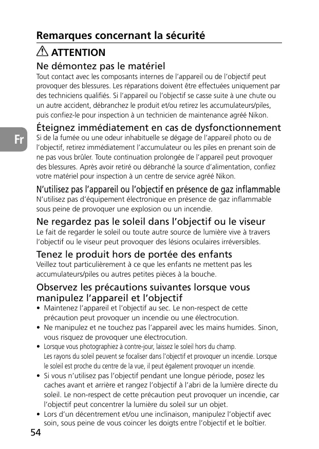 Remarques concernant la sécurité ATTENTION Ne démontez pas le matériel Tout contact avec les composants internes de l’appareil ou de l’objectif peut provoquer des blessures. Les réparations doivent être effectuées uniquement par des techniciens qualifiés. Si l’appareil ou l’objectif se casse suite à une chute ou un autre accident, débranchez le produit et/ou retirez les accumulateurs/piles, puis confiez-le pour inspection à un technicien de maintenance agréé Nikon.