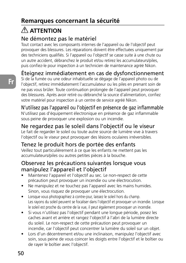 Éteignez immédiatement en cas de dysfonctionnement Si de la fumée ou une odeur inhabituelle se dégage de l'appareil photo ou de l'objectif, retirez immédiatement l'accumulateur ou les piles en prenant soin de ne pas vous brûler. Toute continuation prolongée de l'appareil peut provoquer des blessures. Après avoir retiré ou débranché la source d'alimentation, confiez votre matériel pour inspection à un centre de service agréé Nikon.