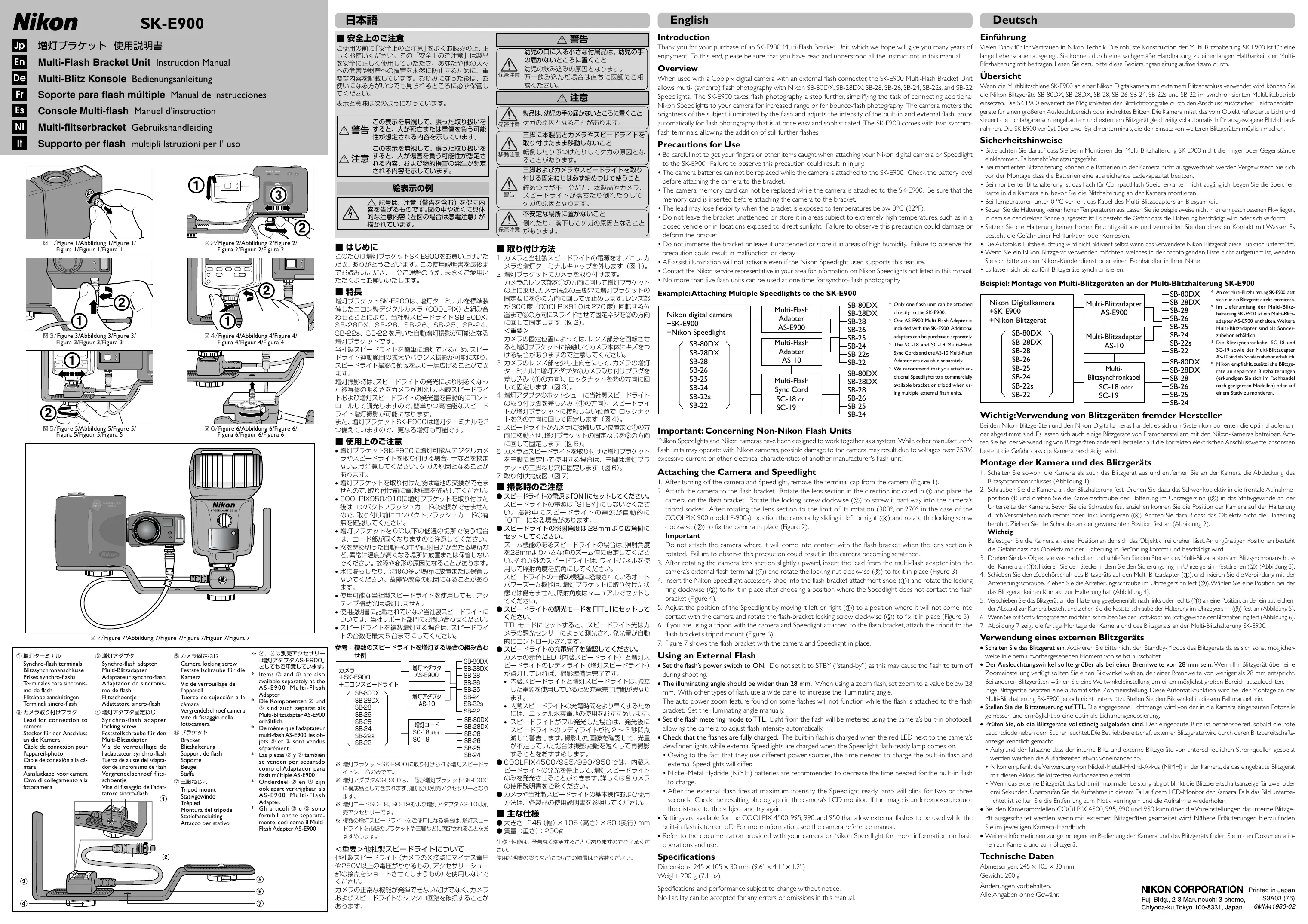 - Référez-vous à la documentation fournie avec votre appareil photo ou avec le flash Nikon pour obtenir de plus amples informations sur les opérations ou utilisations de base. Caractéristiques Dimensions : 245 × 105 × 30 mm Poids : 200 g Les caractéristiques et la performance de ce suppor t sont sujets à modification sans notification préalable du fabricant. Aucune responsabilité n’est acceptée en ce qui concerne d’éventuelles erreurs ou omissions se trouvant dans ce manuel. Generalità Nell’impiego abbinato ad una fotocamera digitale Coolpix dotata di terminale per flash esterni, la staffa SK-E900 consente la sincronizzazione multi-flash con i lampeggiatori Nikon SB-80DX, SB-28DX, SB-28, SB-26, SB-24, SB22s e SB-22. Diventa così particolarmente agevole l’utilizzo di più lampeggiatori allo scopo di ampliare la portata del lampo o di eseguire riprese con la tecnica del lampo riflesso. La fotocamera rileva la luminosità del soggetto illuminato dal flash e regola automaticamente l’intensità di emissione sia del lampeggiatore incorporato sia di quelli esterni, per una ripresa al contempo facile e sofisticata. L’SK-E900 dispone di due terminali di sincronizzazione che consentono l’aggiunta di ulteriori flash. Precauzioni per l’uso
